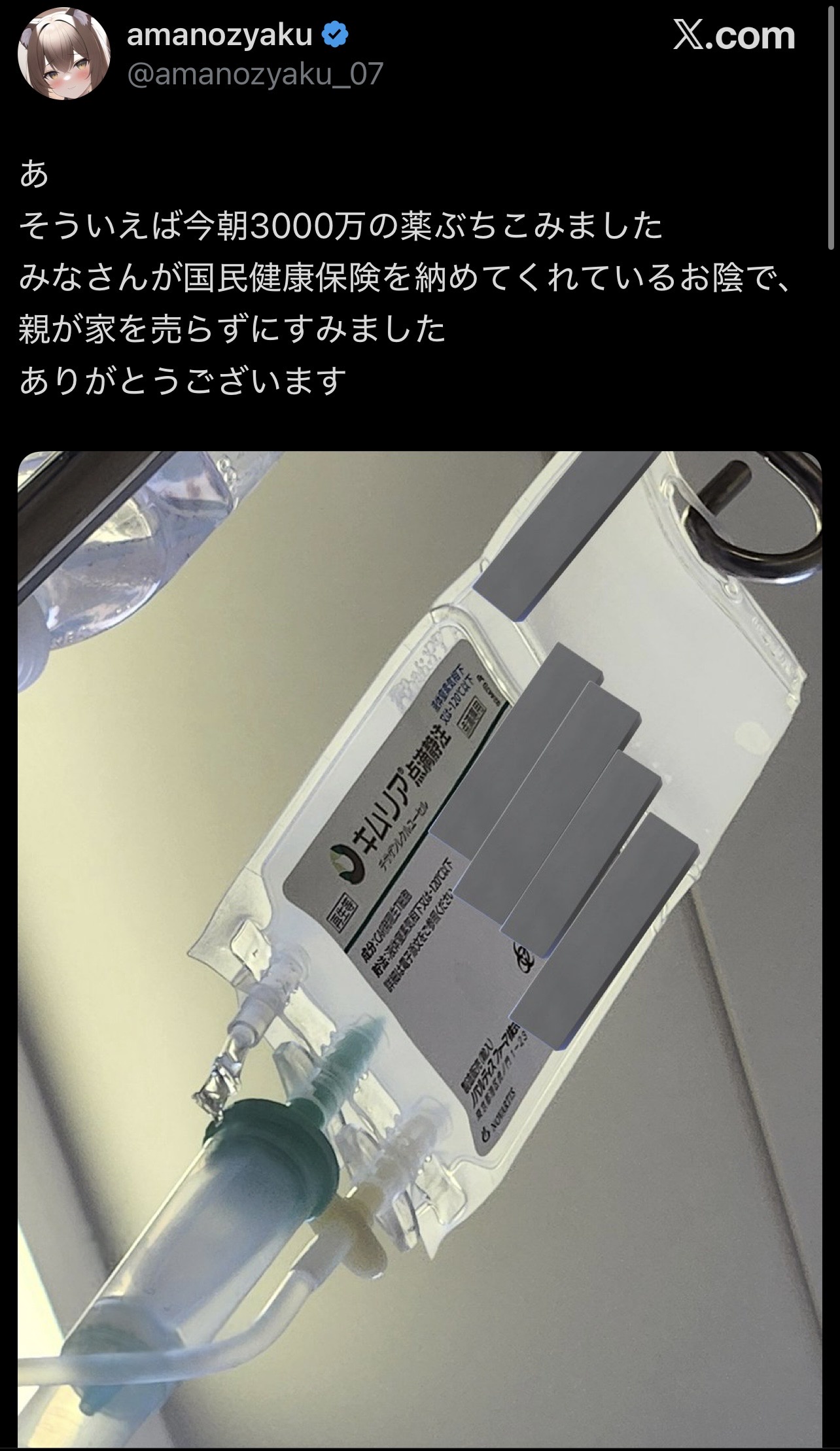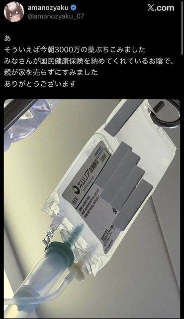 X民「今朝3000万円の薬を皆さんが納めてくれた国民健康保険のおかけでぶち込めました」