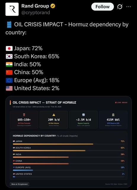 🛢️ OIL CRISIS IMPACT – Hormuz dependency by country: