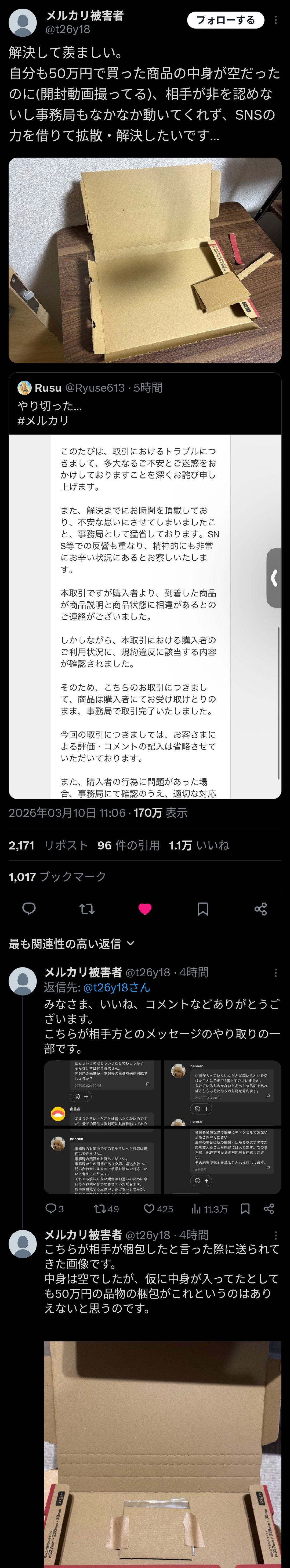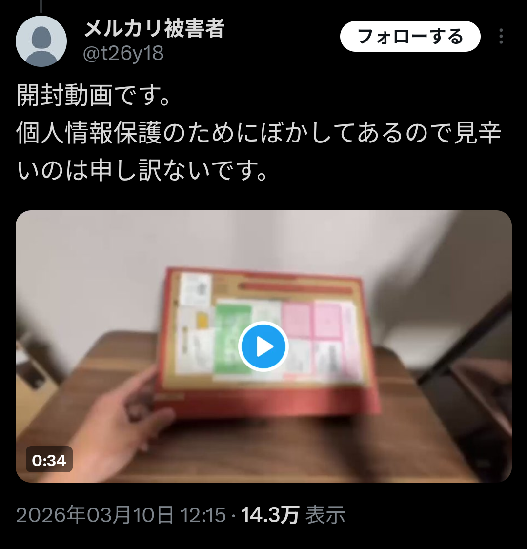 自分も50万円で買った商品の中身が空だったのに(開封動画撮ってる)、相手が非を認めないし事務局もなかなか動いてくれず、SNSの力を借りて拡散・解決したいです… pic.twitter.com/UkpKvnXKhP— Fcu (@Fcu__Fcu) March 10, 2026