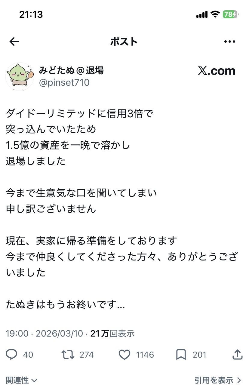 信用3倍で投資した人、1日で1.5億円を溶かし絶望してしまうwww