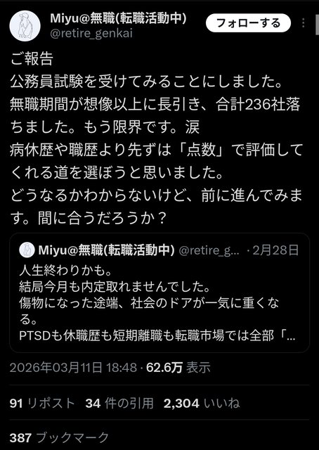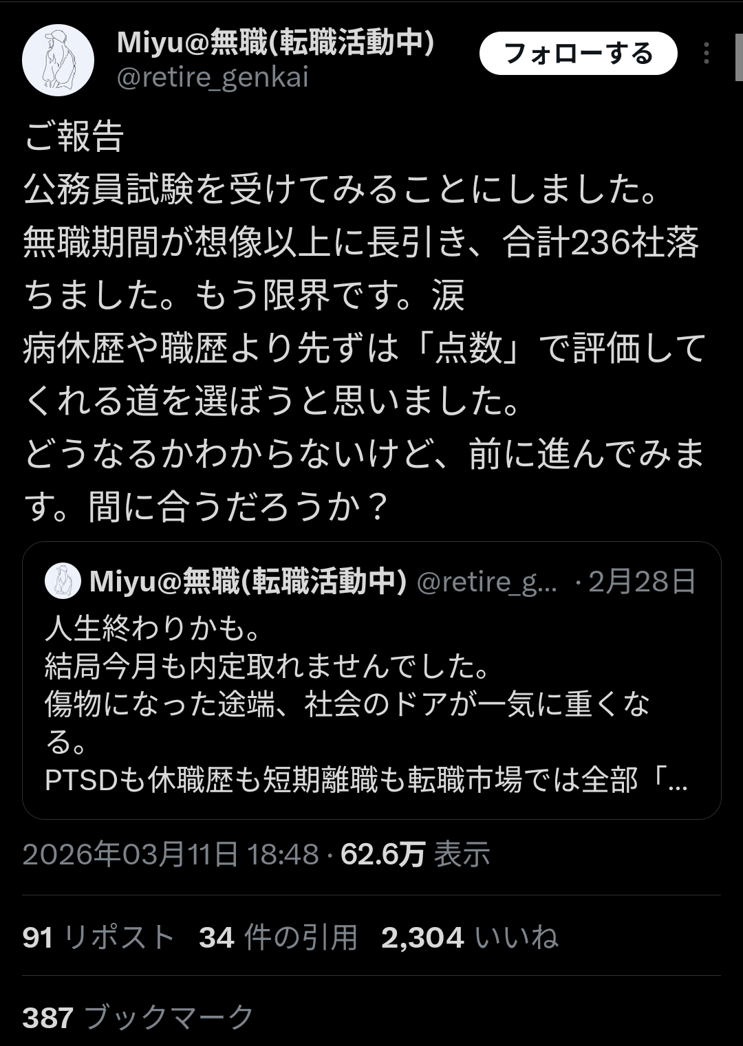 【悲報】236社落ちた女さん、全てを諦める「もう公務員でいいや…」