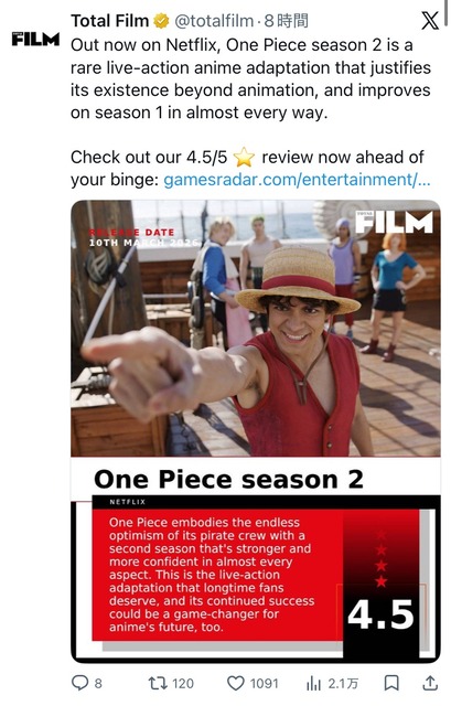 【画像】実写版ワンピース、海外でとんでもない高評価を獲得していたwww