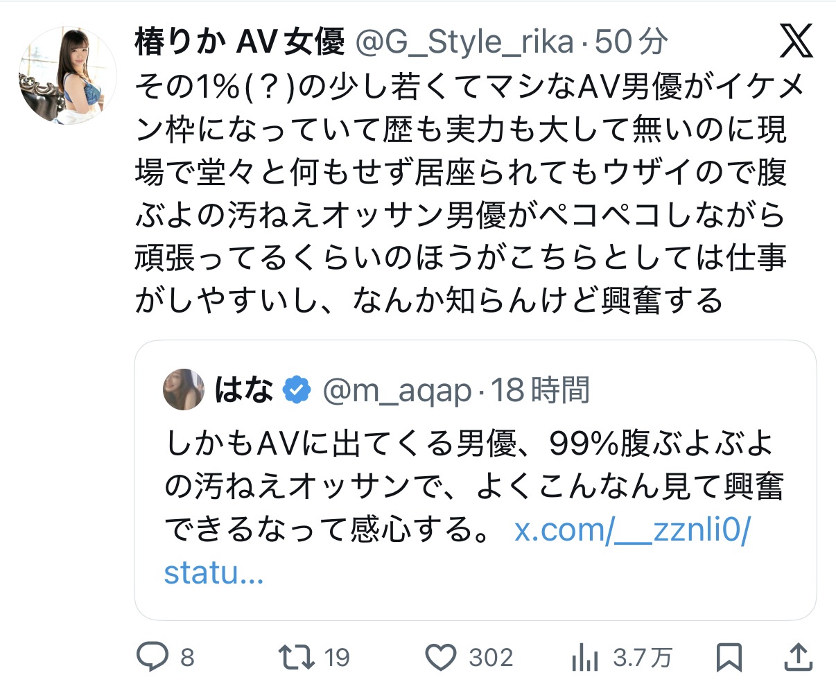その1%(?)の少し若くてマシなAV男優がイケメン枠になっていて歴も実力も大して無いのに現場で堂々と何もせず居座られてもウザイので腹ぶよの汚ねえオッサン男優がペコペコしながら頑張ってるくらいのほうがこちらとしては仕事がしやすいし、なんか知らんけど興奮する https://t.co/yq98Mo7XEO