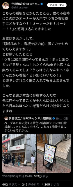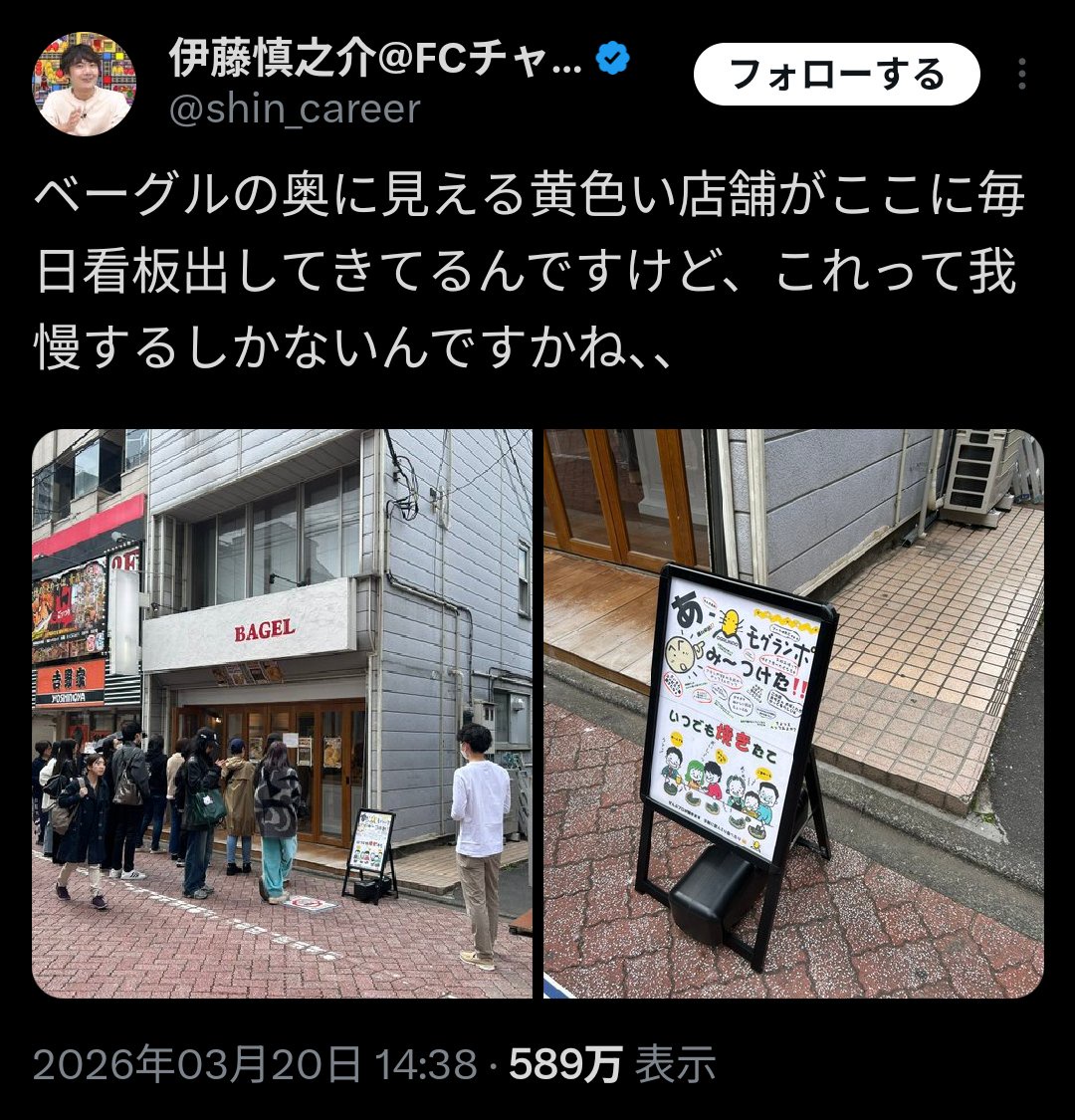 【画像】20年間道路に立て看板を置いてる商店街に引っ越したベーグル屋「道路に立て看板置くのやめろ!」どちらが正論か話題に・・・