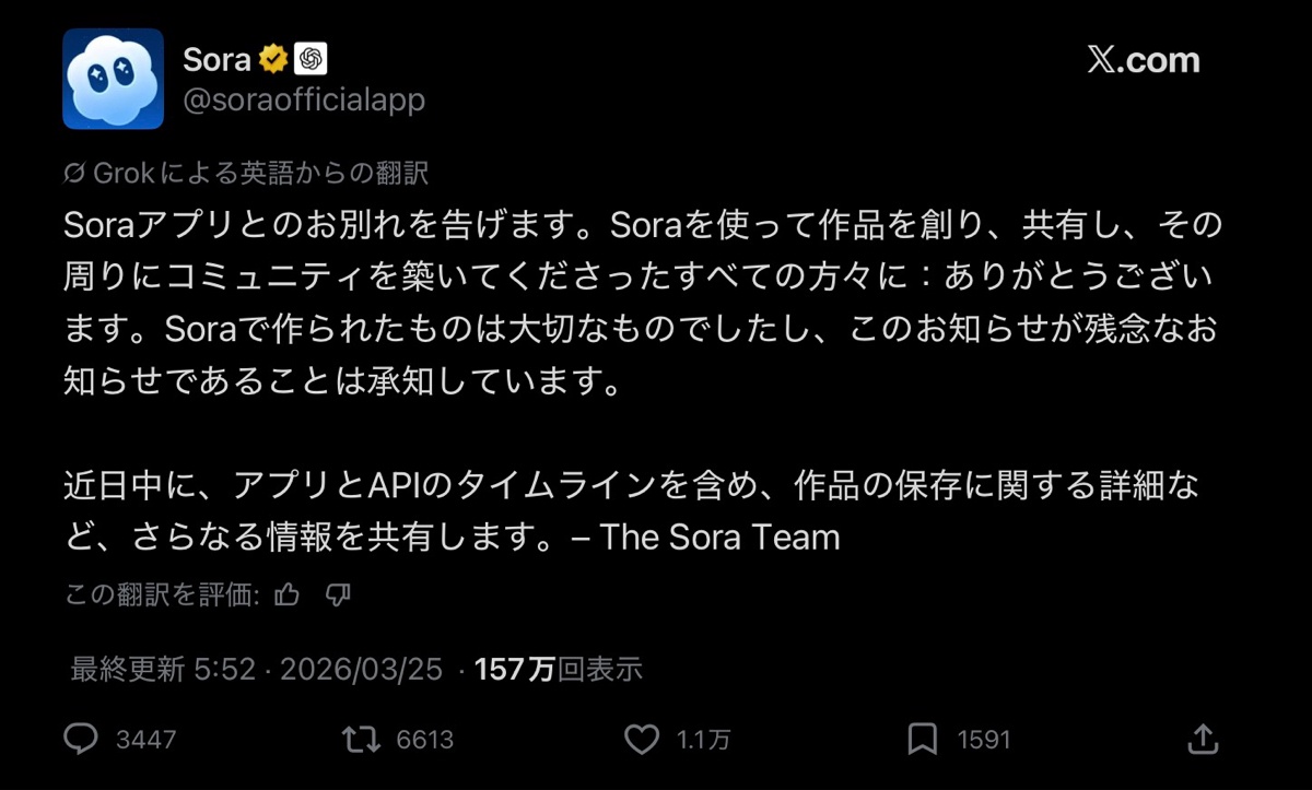 米OpenAIが、最近大きな話題を呼んだ動画生成AIアプリ「Sora」を終了すると発表した。
