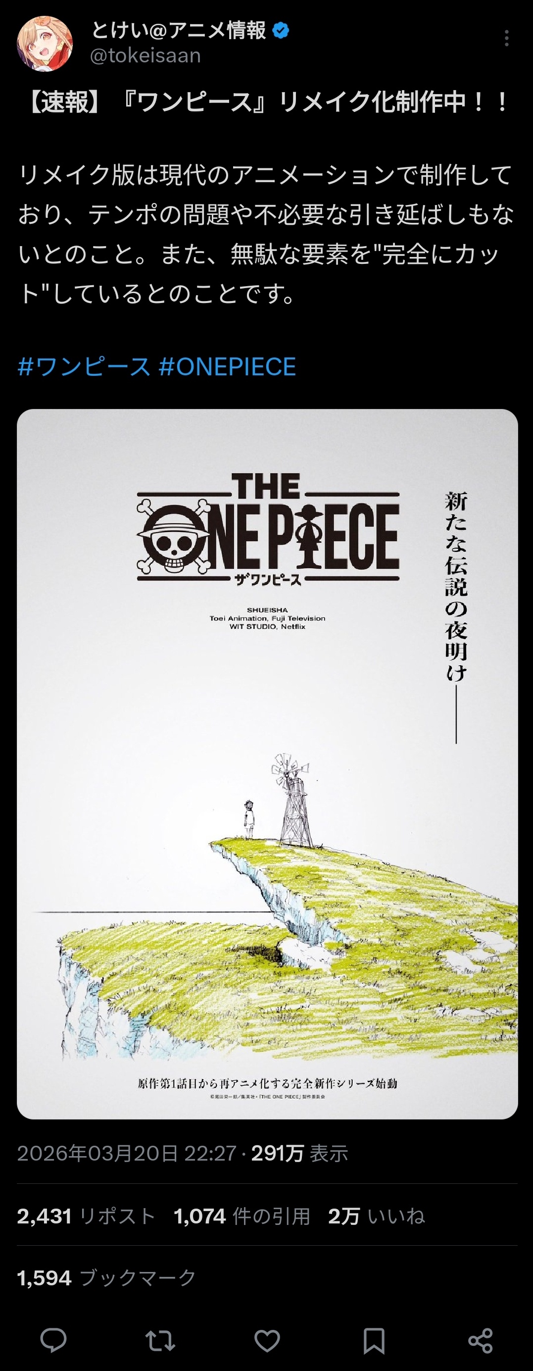 リメイク版ワンピース、無駄な引き延ばしを徹底的に排除する方針wwww