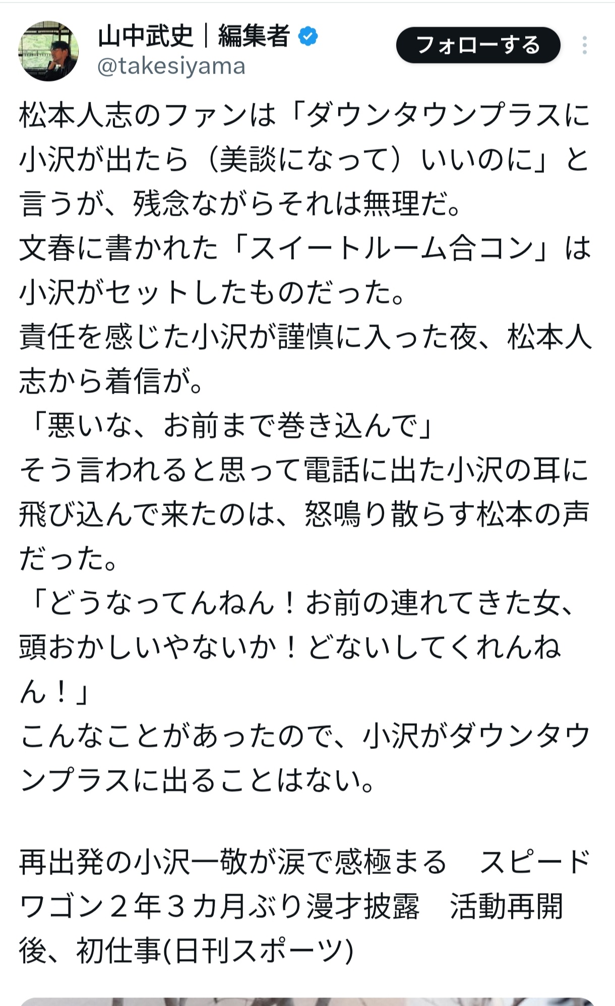 松本人志のファンは「ダウンタウンプラスに小沢が出たら(美談になって)いいのに」と言うが、残念ながらそれは無理だ。