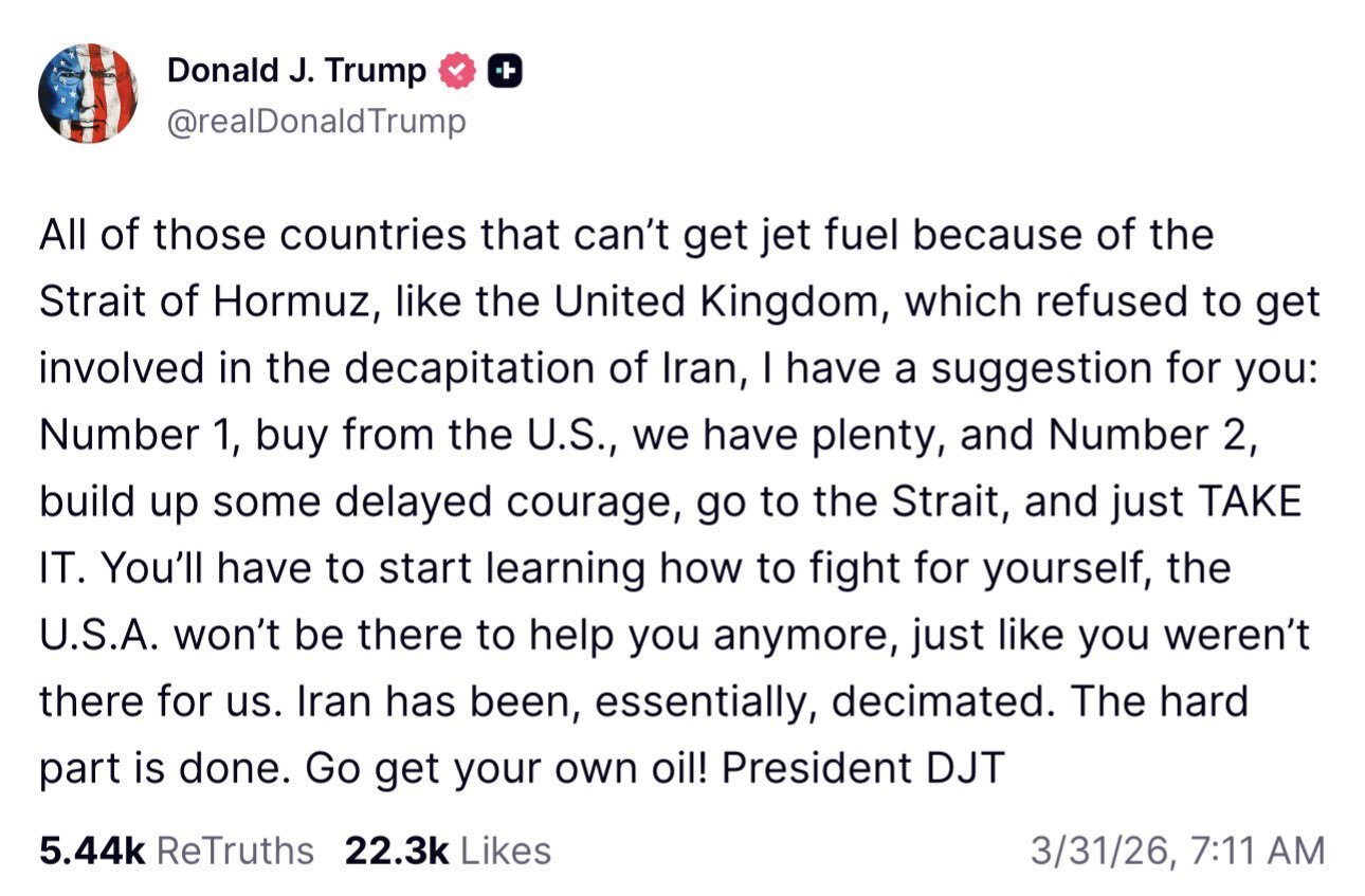 ホルムズ海峡のせいでジェット燃料を手に入れられない国々――たとえばイギリスのように、イランの首切り役に加わるのを拒んだ国々に、ひとつ提案がある。1つ目、アメリカから買え。うちには十分ある。2つ目、今さらでも少しは度胸をつけて、海峡へ行って、ただ奪い取れ。もう自分のために戦うことを覚えなければならない。アメリカはもうお前たちを助けない。お前たちが我々を助けなかったのと同じようにな。イランは実質的に壊滅した。難しい部分はもう終わった。自分たちの石油は自分で取りに行け!大統領 DJT