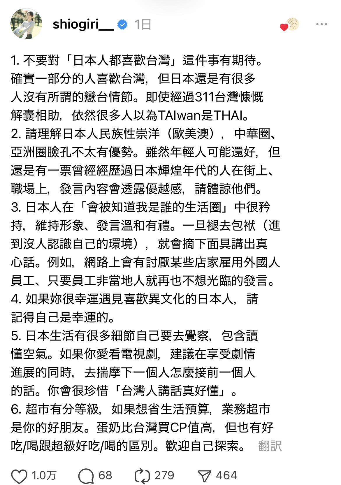 1. 「日本人はみんな台湾好き」みたいな期待はしないで。実際、台湾が好きな人は一部いるけど、いわゆる親台感情がない人だって全然いる。311のときに台湾があれだけ助けてあげたのに、いまだに台湾をタイだと思ってる人も結構いる。