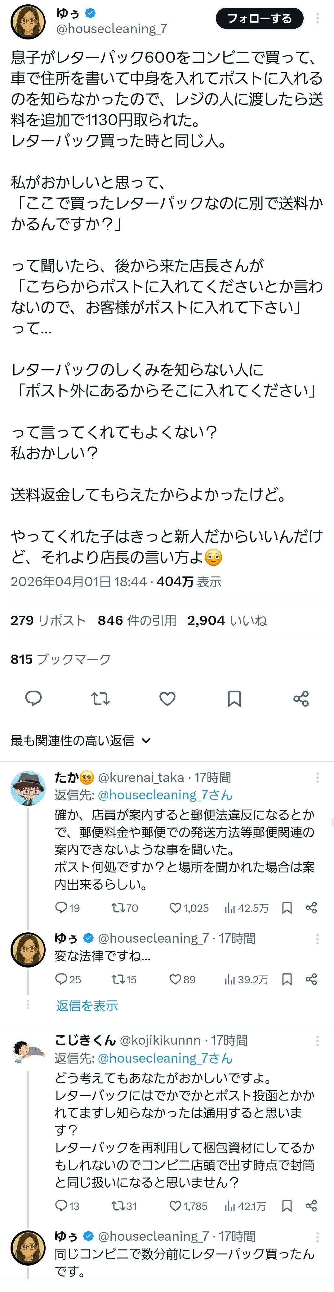 「ここで買ったレターパックなのに別で送料かかるんですか?」…— ゆぅ (@housecleaning_7) April 1, 2026