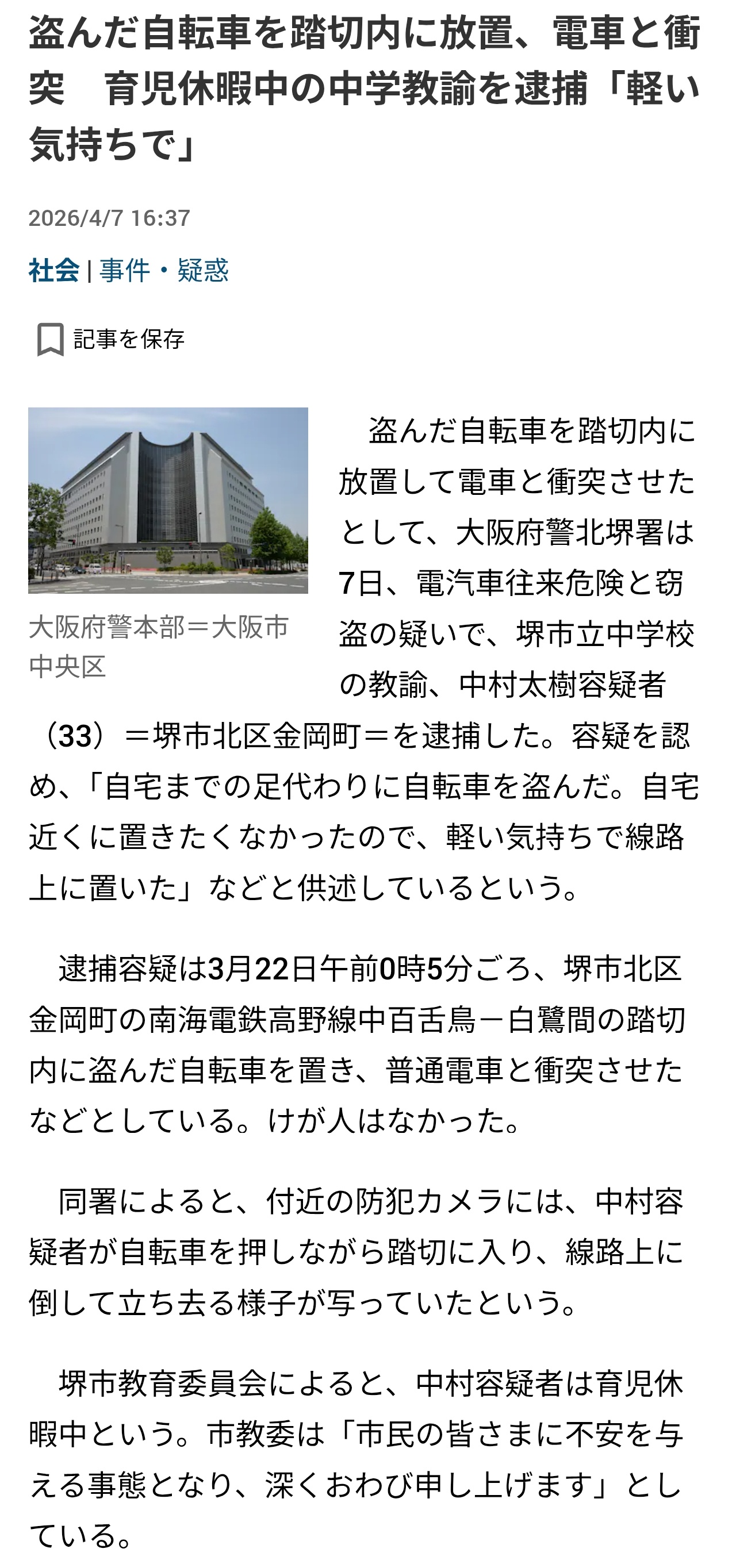 「自宅までの足代わりに自転車を盗んだ。自宅近くに置きたくなかったので、軽い気持ちで線路上に置いた」