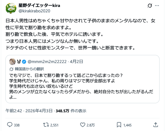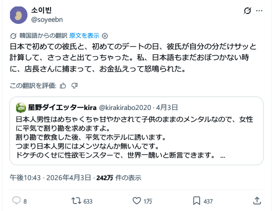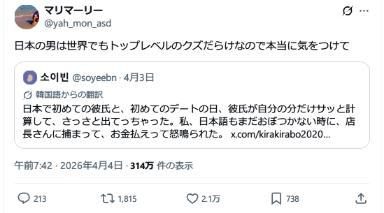 「日本人男性はめちゃくちゃ甘やかされて子供のままのメンタルなので、女性に平気で割り勘を求めますよ。」3万いいね