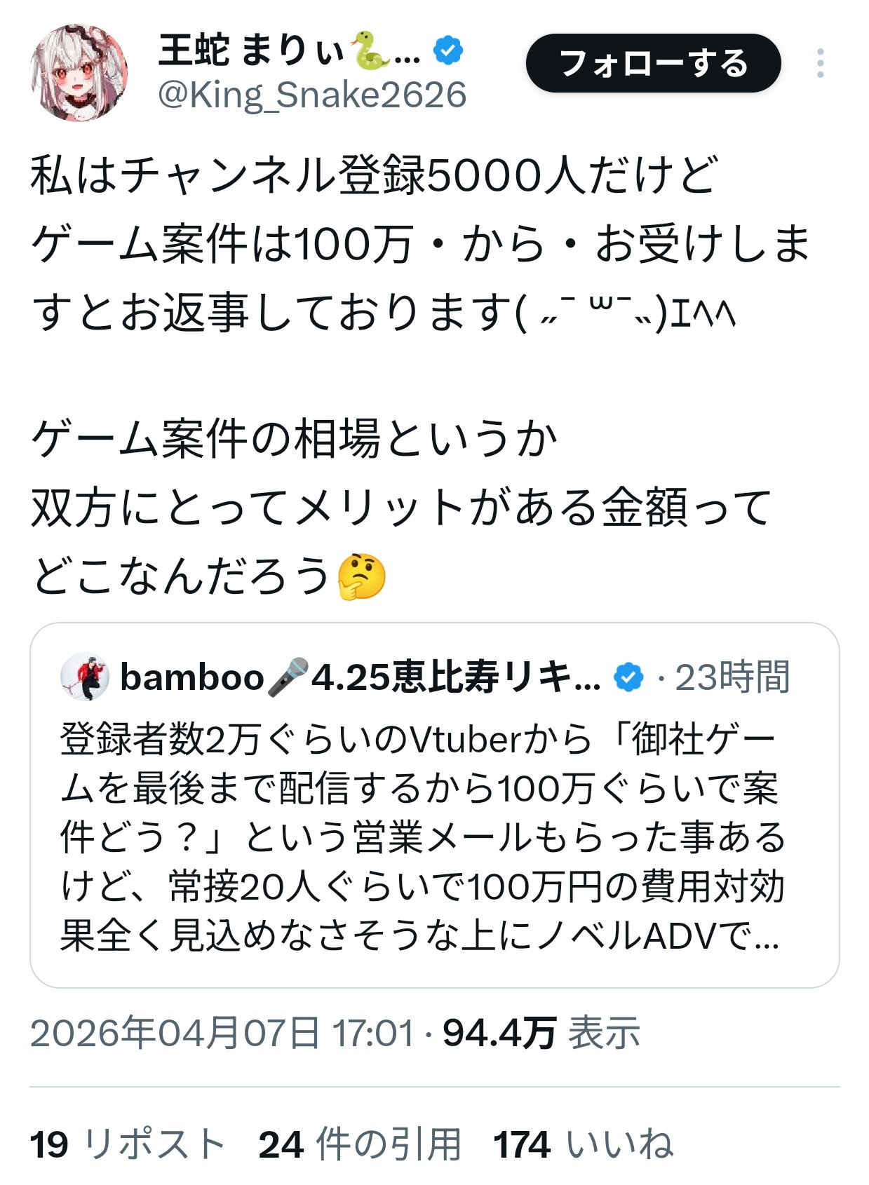 例えばホロにゲームの案件出したらいくらいるの?