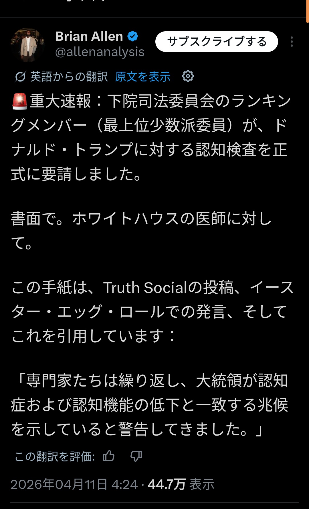 アメリカ議会「トランプはガチで認知症検査を受けろ」