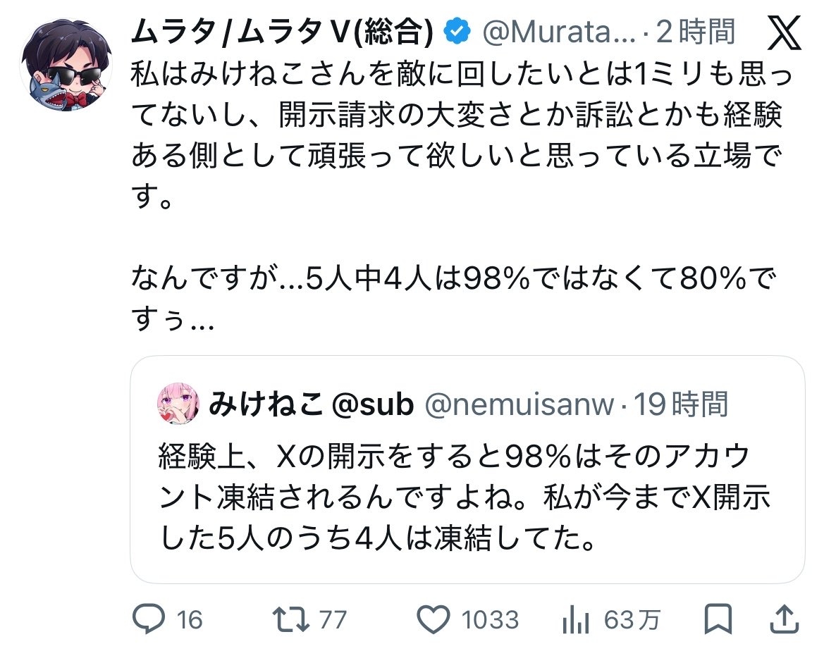みけねこ「開示したアカウントの98%が凍結される!5人中4人がそうだった」アンチ「80%ですよ」みけねこ「え?」