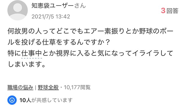女「なんで男の人っていきなり野球の投げる動作とか素振りとかしてるの?イライラする」 2026年4月18日 最終更新日時 : 2026年4月18日 ココナラwordpress 広告エリア 【悲報】羽生善治さん、昼飯でボッタクリ被害に遭う 【画像】東京のテレビ局さん、夕方5時にとんでもない人たちを映してしまうwwwwwwww 鋼鉄、炎、友情、そして少年アニメが融合したサンドボックス型タクティカルRPG『NITRO GEN OMEGA ナイトロジェンオメガ』5/12リリース決定、PSStoreで体験版が配信開始 ナポリ会長「サッカーの試合時間90分は長すぎ、50分でいい。退屈すぎてこのままではサッカーは若い世代を失うぞ!」 【悲報】イラン戦争へ派兵された米軍の食事、あまりにも〇〇すぎて炎上www 【悲報】高市早苗グッズ販売業者「200本発注した早苗歯ブラシが2本しか売れなくて大赤字…」←これ! 外国人たちの間で『ナンバープレートなし運転』が大ブームに 日本の警察はスルー 女「なんで男の人っていきなり野球の投げる動作とか素振りとかしてるの?イライラする」 【閲覧注意】独身女子(35)の部屋、リアルすぎる!・・・・・・(画像あり) 7/9発売予定『Echoes of Aincrad』新トレーラー公開、映画館イベント招待キャンペーンは日曜締切 女「なんで男の人っていきなり野球の投げる動作とか素振りとかしてるの?イライラする」 1:名無し :2026/04/17(金) 14:59:25.796ID:I6f2gV.kc これまじでなんなんや? 2:名無し :2026/04/17(金) 14:59:41.795ID:I6f2gV.kc 話してる途中にいきなりやり始めるからビビる 3:名無し :2026/04/17(金) 14:59:59.590ID:lf.9e2p/6 草 確かに 続きを読む 続きを見る(外部サイト) 広告エリア 【悲報】羽生善治さん、昼飯でボッタクリ被害に遭う 【画像】東京のテレビ局さん、夕方5時にとんでもない人たちを映してしまうwwwwwwww 鋼鉄、炎、友情、そして少年アニメが融合したサンドボックス型タクティカルRPG『NITRO GEN OMEGA ナイトロジェンオメガ』5/12リリース決定、PSStoreで体験版が配信開始 ナポリ会長「サッカーの試合時間90分は長すぎ、50分でいい。退屈すぎてこのままではサッカーは若い世代を失うぞ!」 【悲報】イラン戦争へ派兵された米軍の食事、あまりにも〇〇すぎて炎上www 【悲報】高市早苗グッズ販売業者「200本発注した早苗歯ブラシが2本しか売れなくて大赤字…」←これ! 外国人たちの間で『ナンバープレートなし運転』が大ブームに 日本の警察はスルー 女「なんで男の人っていきなり野球の投げる動作とか素振りとかしてるの?イライラする」 関連記事 7/9発売予定『Echoes of Aincrad』新トレーラー公開、映画館イベント招待キャンペーンは日曜締切 「SAO」新作アクションRPG『Echoes of Aincrad』7/9リリース決定、予約受付も開始。製品情報やスペシャルイベントの開催など一挙情報解禁 7/9発売予定 SAOゲーム新作アクションRPG『Echoes of Aincrad』ゲームプレイトレーラーが公開!TVアニメ第1期 《アインクラッド》編の再放送も決定 7/9発売予定 SAOゲーム新作アクションRPG『Echoes of Aincrad』ストーリートレーラーが公開!TVアニメ第1期 《アインクラッド》編の再放送は4/6~