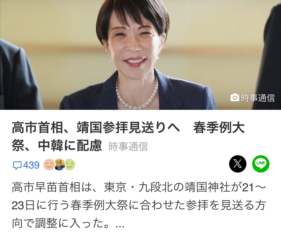 高市早苗「すまん、やっぱ靖国神社参拝無理やわw」