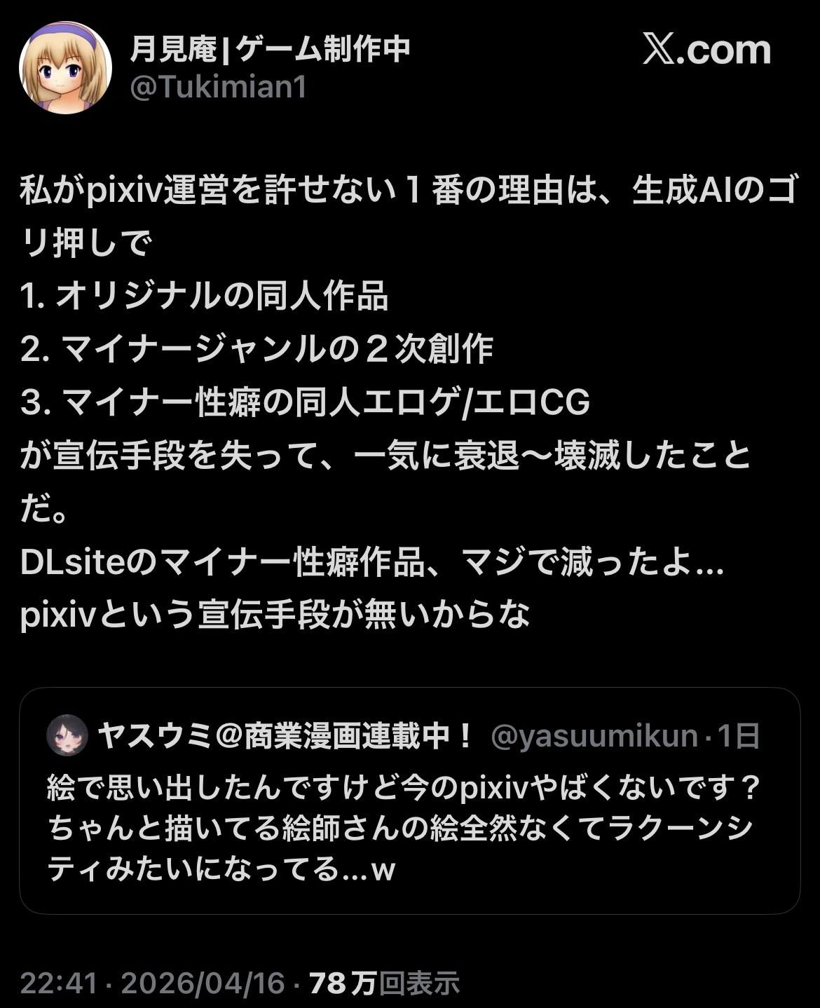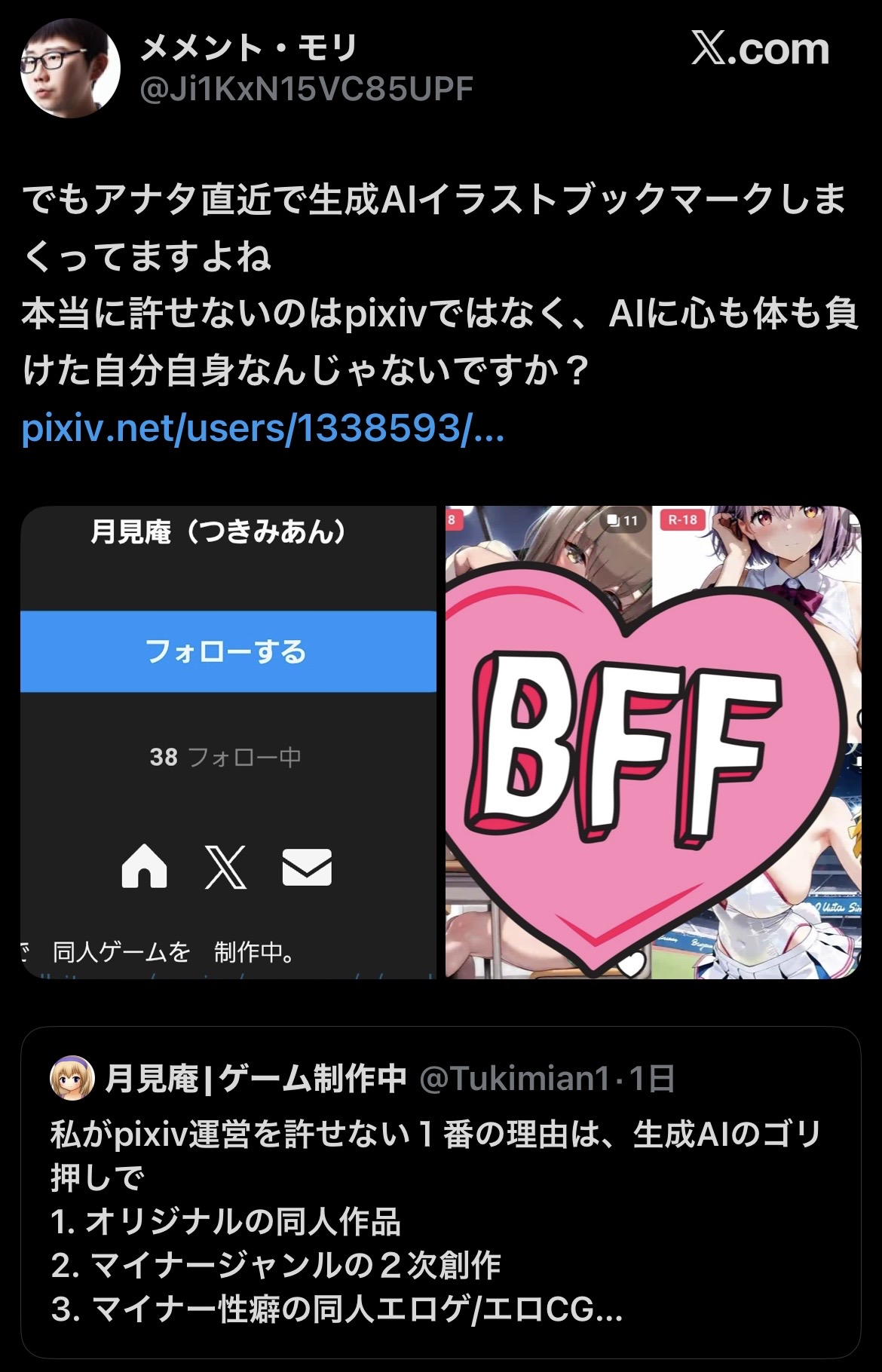 【悲報】反AIさん、pixivでAIイラストをブックマークしてることがバレて逝く 2026年4月19日 最終更新日時 : 2026年4月19日 ココナラwordpress 広告エリア 【仰天】しゃぶ葉の薄切り技術、我々の想像を超えてくるwwwww (※画像あり) 【驚愕】性欲が最も強くなる年齢層が明らかにwwwwwwwww 『X-COM』の生みの親が手掛ける『Chip ‘n Clawz vs. The Brainioids』の有料DLC「Going Underground」がリリース! 【画像】藤井隆(54)、ユーザーだとバレて謝罪するwwwwwwwwwww 【緊急】ライザップ、正社員500人が土方に配置転換されるwwwwww 【悲報】多部未華子(37)、若い頃となんだか顔が違うと指摘されてしまう→(画像アリ) 田舎者ワイ 東京から逃げたい 【悲報】反AIさん、pixivでAIイラストをブックマークしてることがバレて逝く 【愕然】安達結希くんの親族「変な男が住み着いて あいさつもしない」⇒ (※画像あり) 2026年4月19日(日)付け 今週発売予定のPS5・PS4ゲームソフトをピックアップ! 【悲報】反AIさん、pixivでAIイラストをブックマークしてることがバレて逝く 1:名無し :2026/04/18(土) 15:32:18.607ID:Qas7U8.8T チ●コは正直で草 2:名無し :2026/04/18(土) 15:33:04.757ID:Qas7U8.8T 賢者モードだったんやろなぁ 続きを読む 続きを見る(外部サイト) 広告エリア 【仰天】しゃぶ葉の薄切り技術、我々の想像を超えてくるwwwww (※画像あり) 【驚愕】性欲が最も強くなる年齢層が明らかにwwwwwwwww 『X-COM』の生みの親が手掛ける『Chip ‘n Clawz vs. The Brainioids』の有料DLC「Going Underground」がリリース! 【画像】藤井隆(54)、ユーザーだとバレて謝罪するwwwwwwwwwww 【緊急】ライザップ、正社員500人が土方に配置転換されるwwwwww 【悲報】多部未華子(37)、若い頃となんだか顔が違うと指摘されてしまう→(画像アリ) 田舎者ワイ 東京から逃げたい 【悲報】反AIさん、pixivでAIイラストをブックマークしてることがバレて逝く 関連記事 2026年4月19日(日)付け 今週発売予定のPS5・PS4ゲームソフトをピックアップ! 【愕然】安達結希くんの親族「変な男が住み着いて あいさつもしない」⇒ (※画像あり) 【動画】USJ、Tiktokerの撮影会場と化して外人困惑してしまうwwwwwwwww 2026年3月1日(日)付け 今週発売予定のPS5・PS4ゲームソフトをピックアップ!