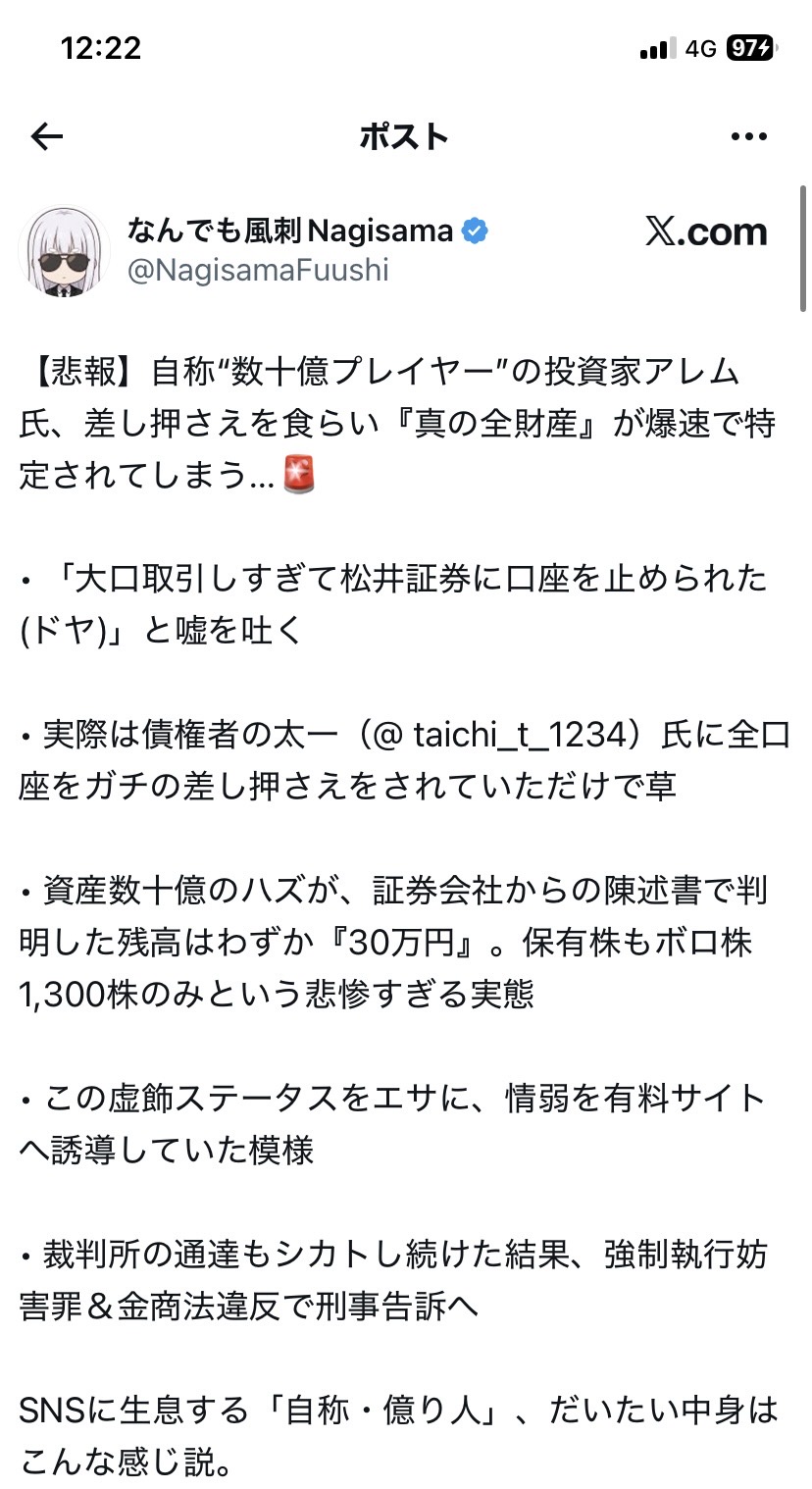 【悲報】自称“数十億プレイヤー”の投資家アレム氏、差し押さえを食らい『真の全財産』が爆速で特定されてしまう…🚨