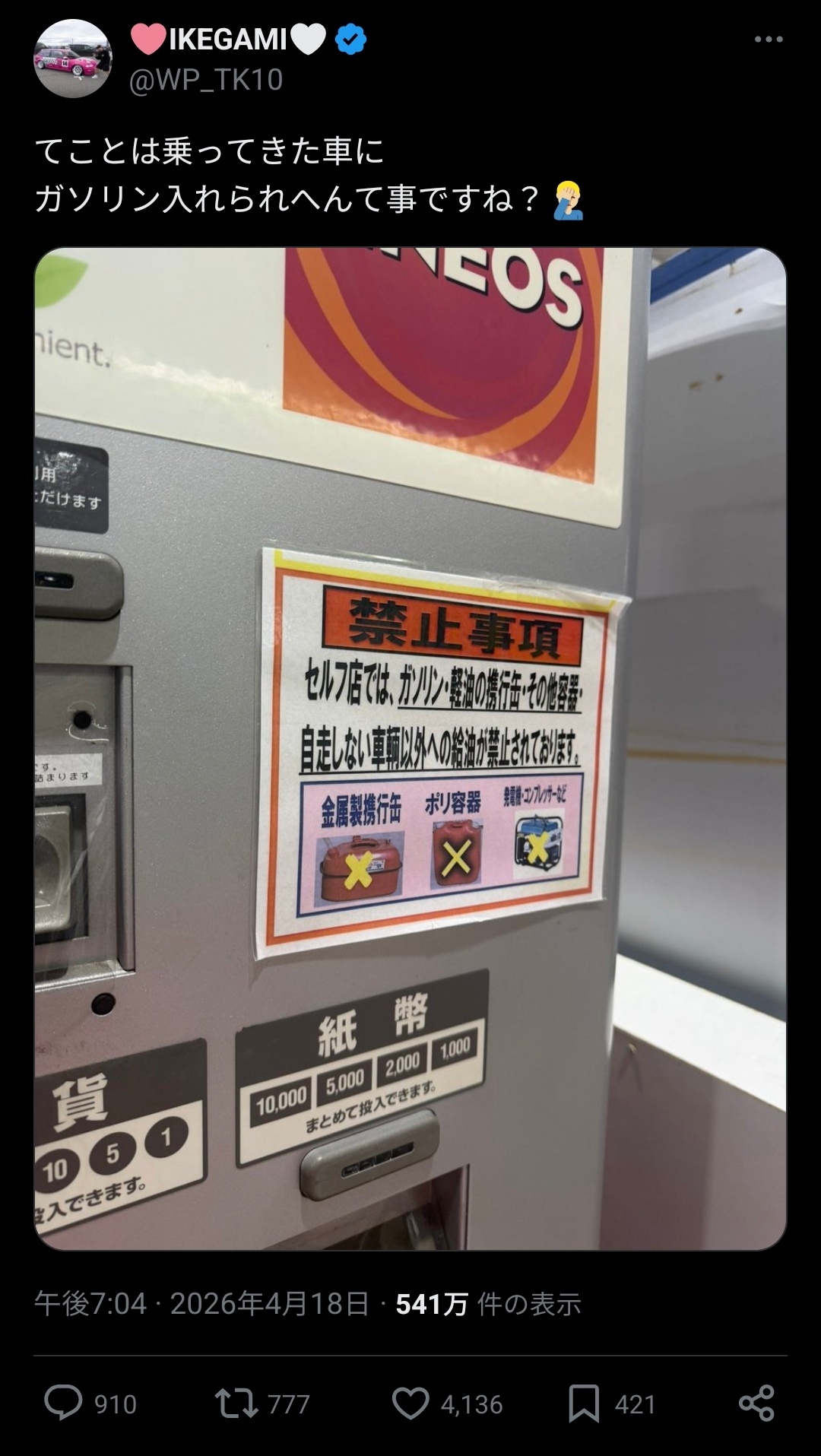 【悲報】ENEOS「ガソスタまで乗ってきた車に給油するな」←ユーザー困惑してしまうwwwwww