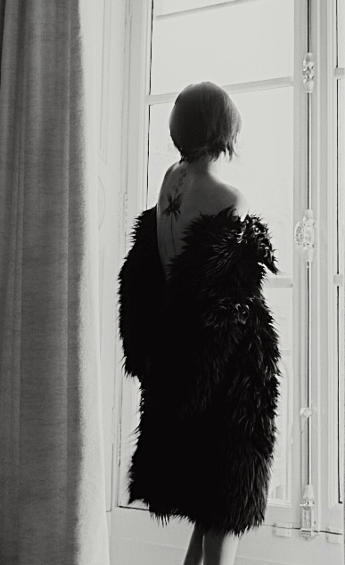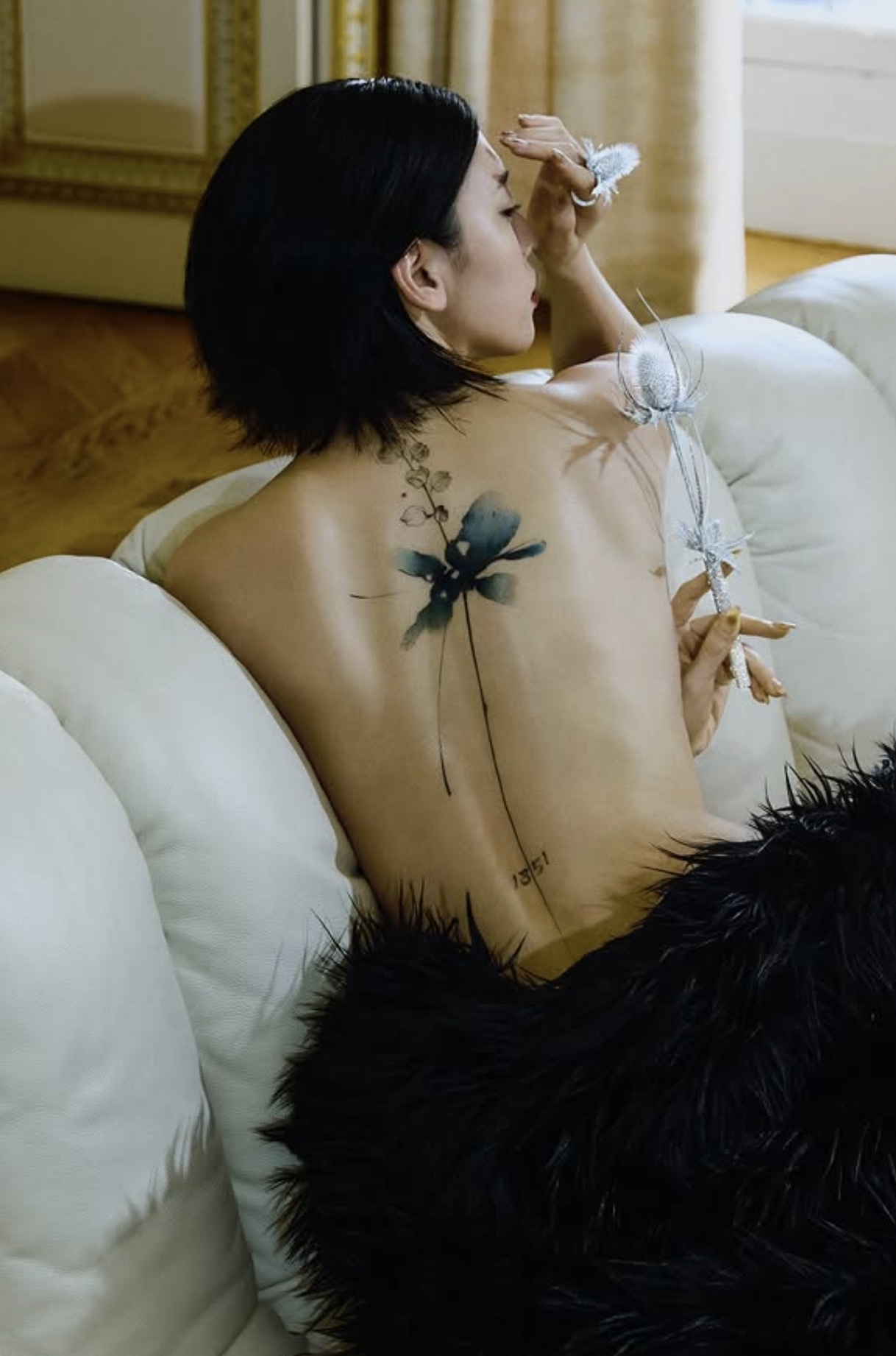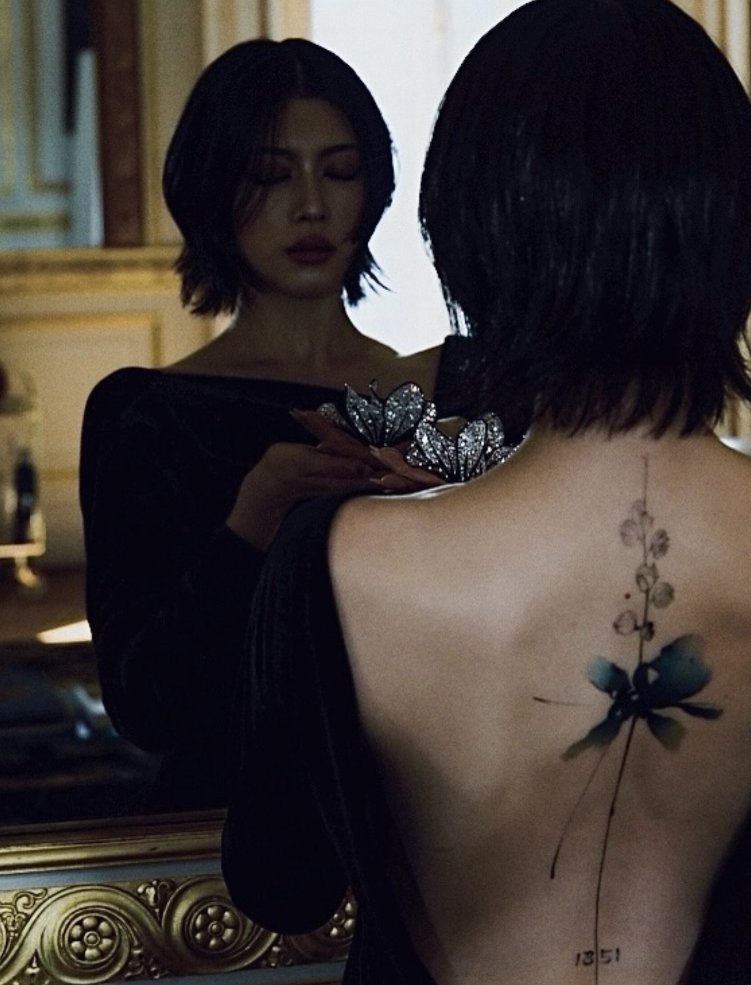 この日、三吉は、フランスの高級宝飾品ブランド『ブシュロン』のアイテムを身に着け、背中が開いている黒いドレスの写真を投稿。その背中はタトゥーが刻まれている。腰から一本の線が伸びていて、背中の中央、肩のあたりで一輪の花が咲いているようなデザインだ。