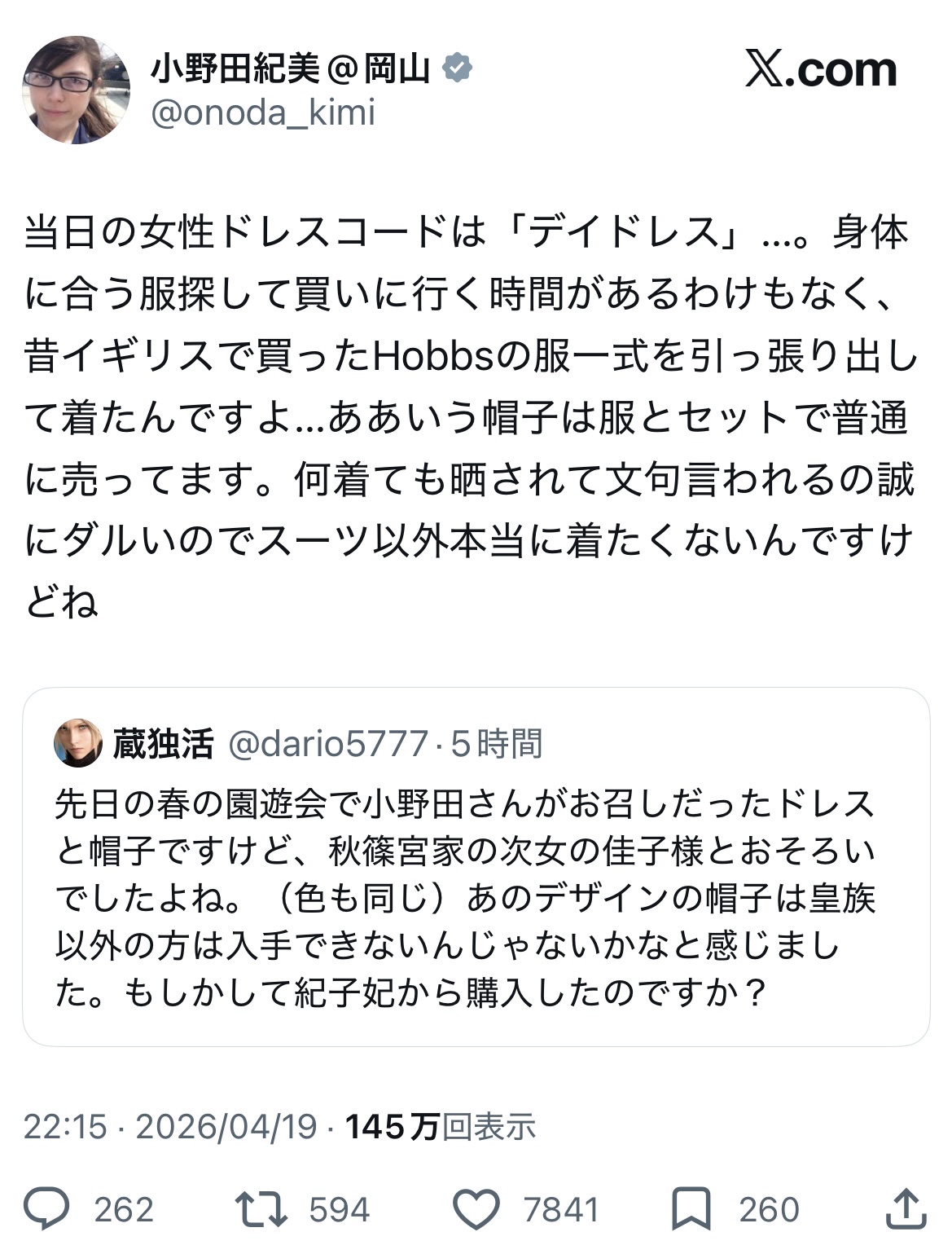 — 小野田紀美@岡山 (@onoda_kimi) April 19, 2026
