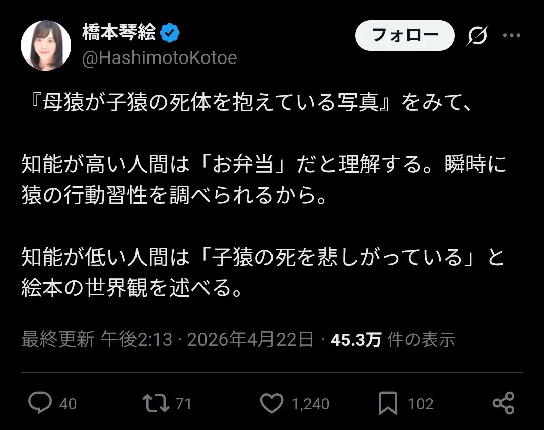 有識者「『母猿が子猿の死体を抱えてる写真』を見て死を悲しんでると思う人は知能が低い。知能が高いとこう」→