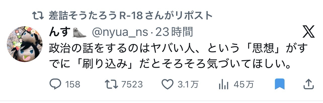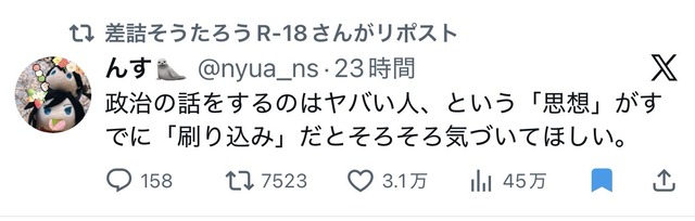 有識者「政治の話をするのはヤバイ人という考えがすでに「刷り込み」ということに気づいてほしい」