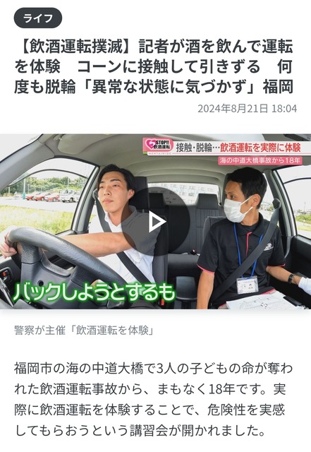 「飲酒して気持ちが大きくなっているというのがあるのかなと思います。運転する前はできると思っていたのですが、いざやってみるとできない。自分が異常な状態にあることに気づいてないということに驚きました。」全文はこちら