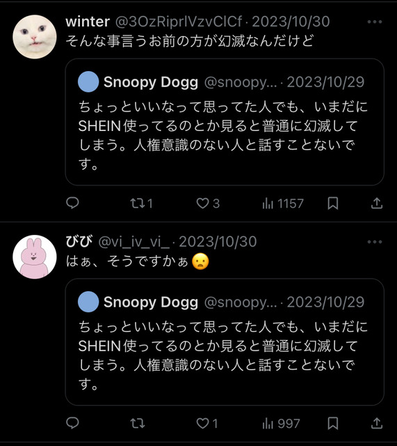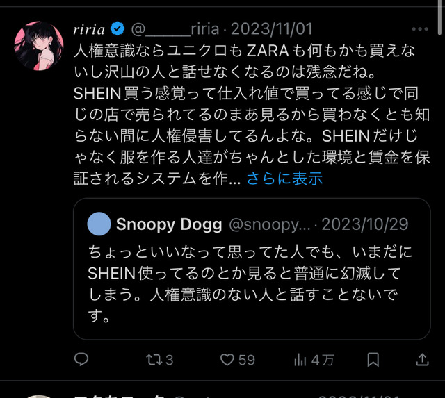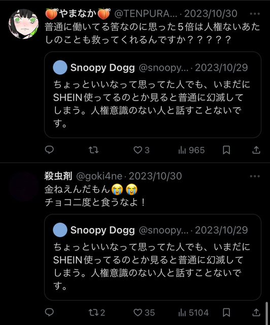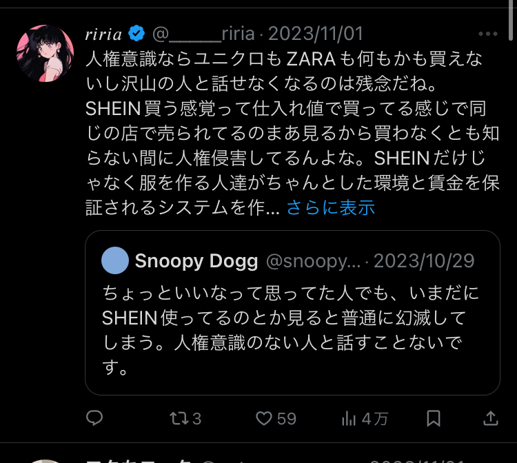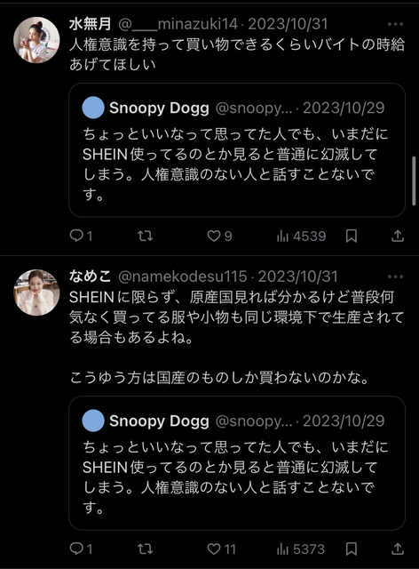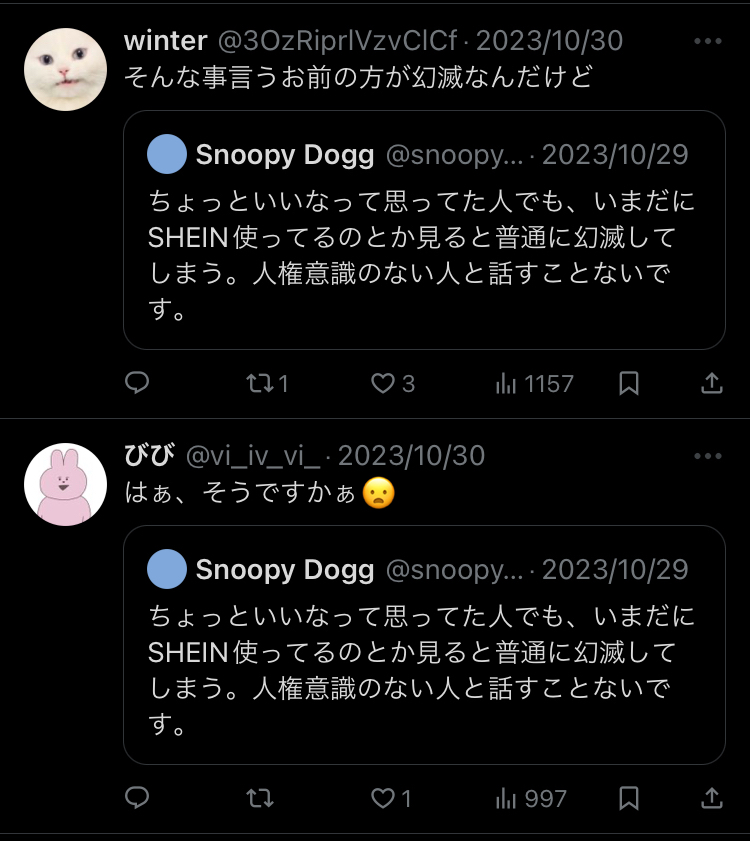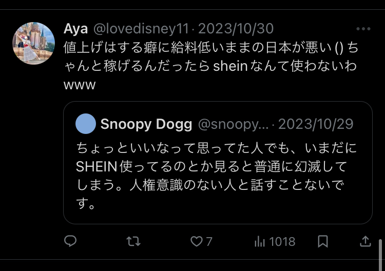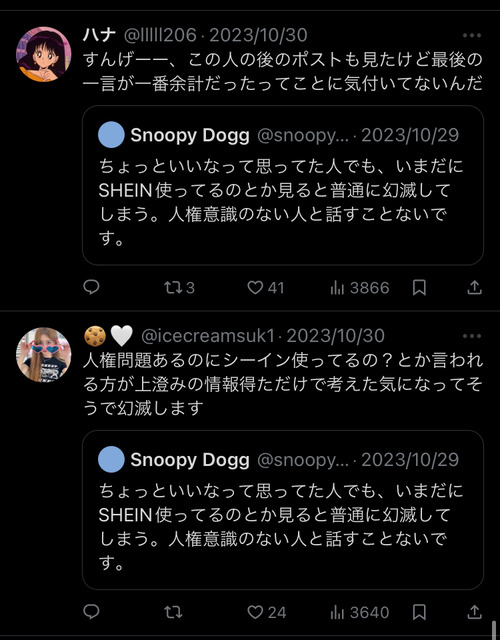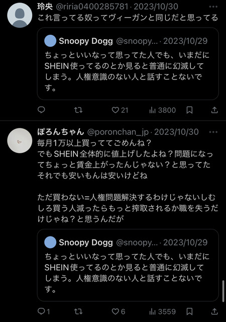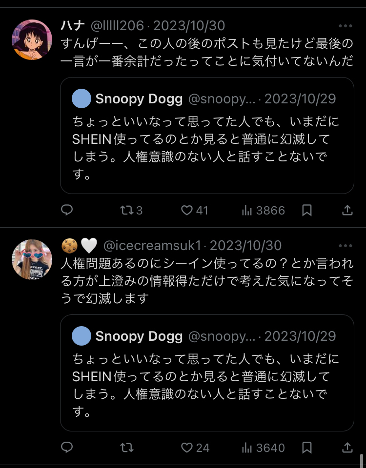 ちょっといいなって思ってた人でも、いまだにSHEIN使ってるのとか見ると普通に幻滅してしまう。人権意識のない人と話すことないです。