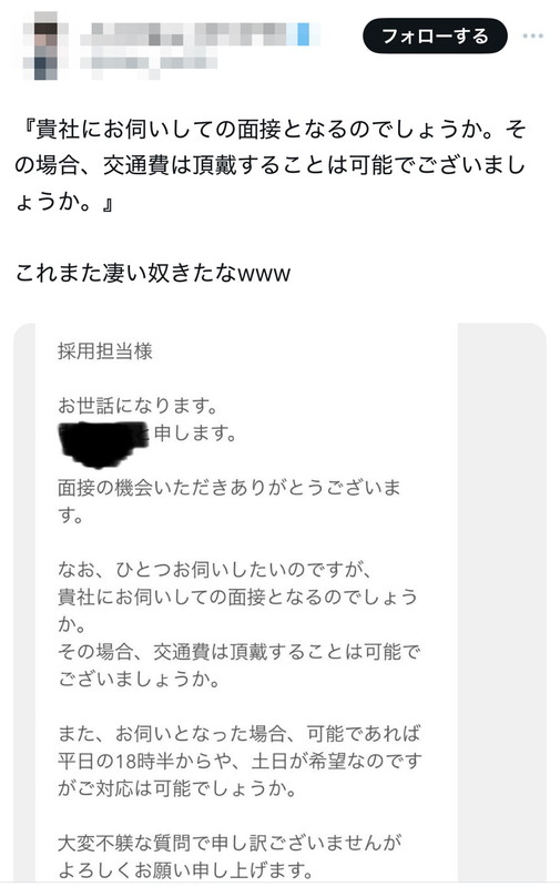 「こんな応募者がきた」と小馬鹿にするような投稿が時々流れてくるけど、「それをわざわざSNSに晒しちゃう担当採用者がいるような会社はちょっと嫌だな」という感想。 pic.twitter.com/QXmiQtxmm5