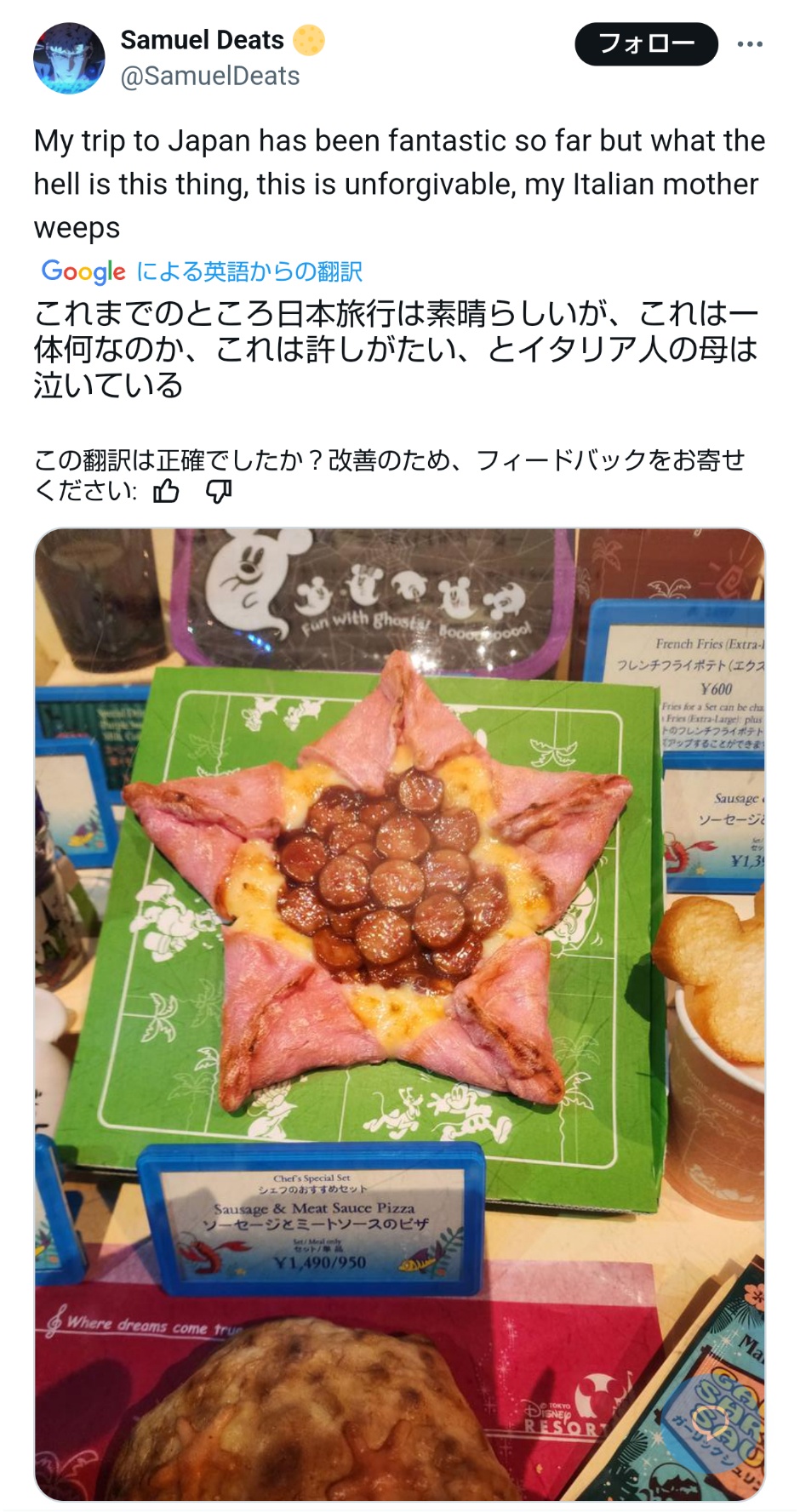 【悲報】米国アニメーション監督「東京ディズニーランドでバカみたいなピザが売られてた。イタリアの母が泣いている」
