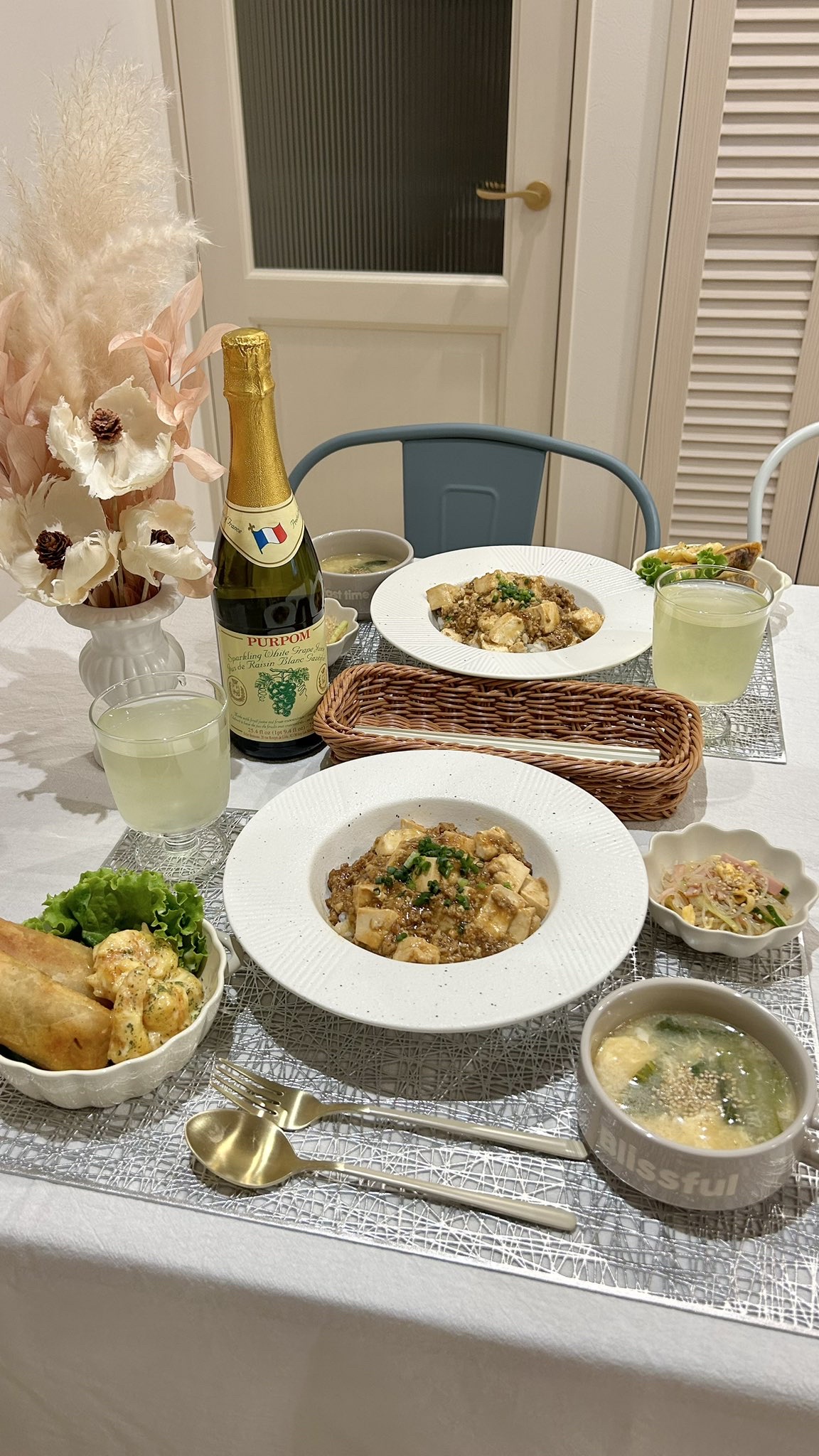 洋風の皿でワインと一緒に麻婆丼食ってるのウケるわ