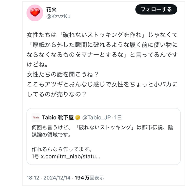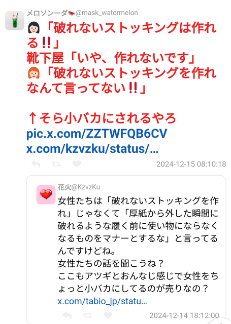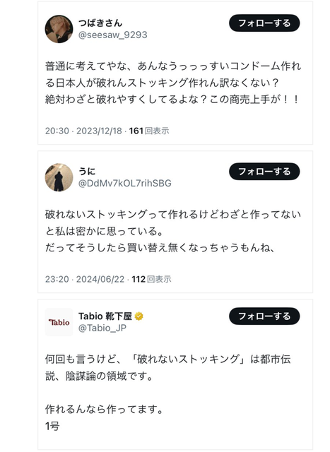 女さん「ストッキングはわざと破れやすく作ってる!」靴下屋「それ陰謀論」女性「😡」