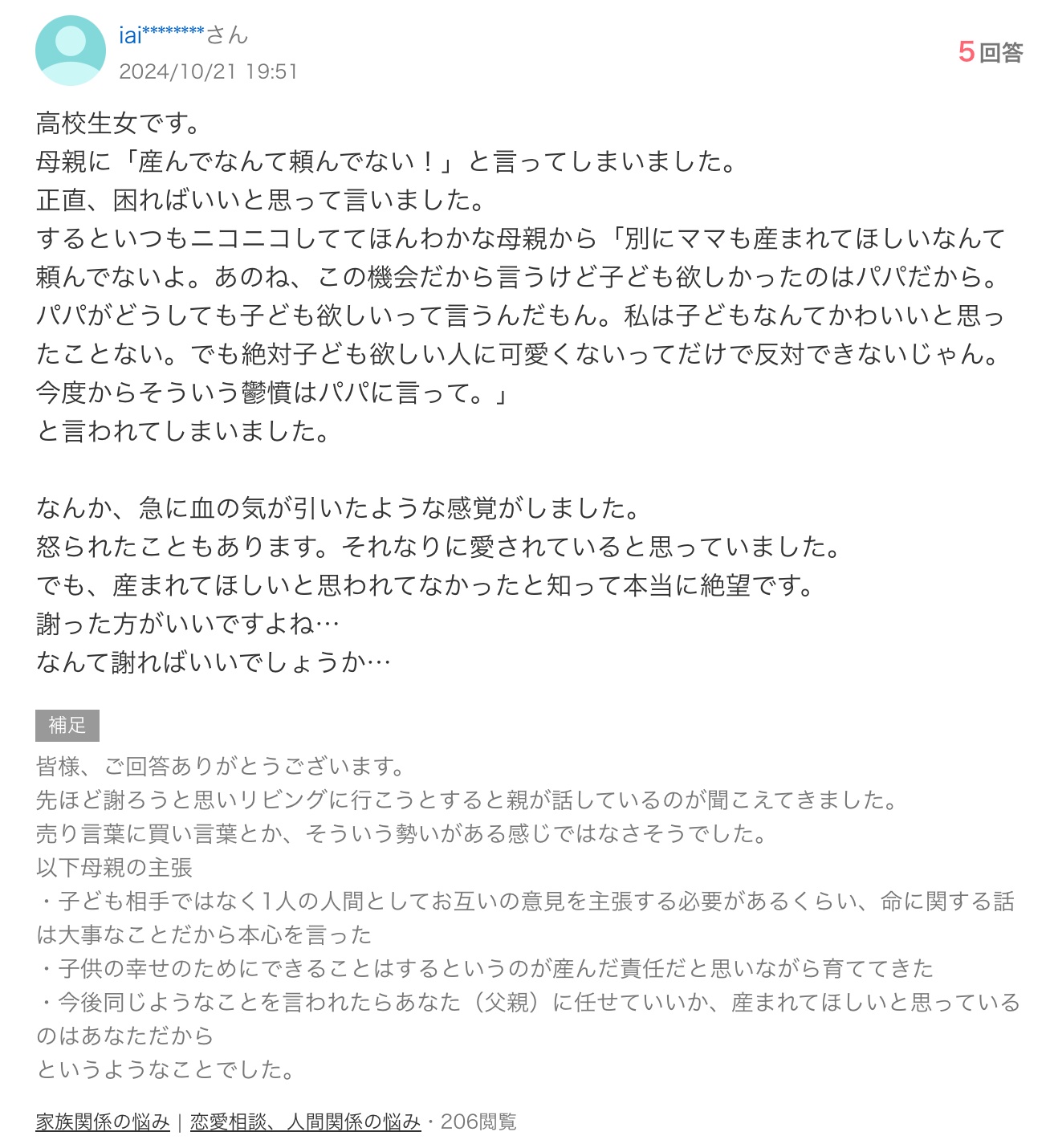 でも、産まれてほしいと思われてなかったと知って本当に絶望です。