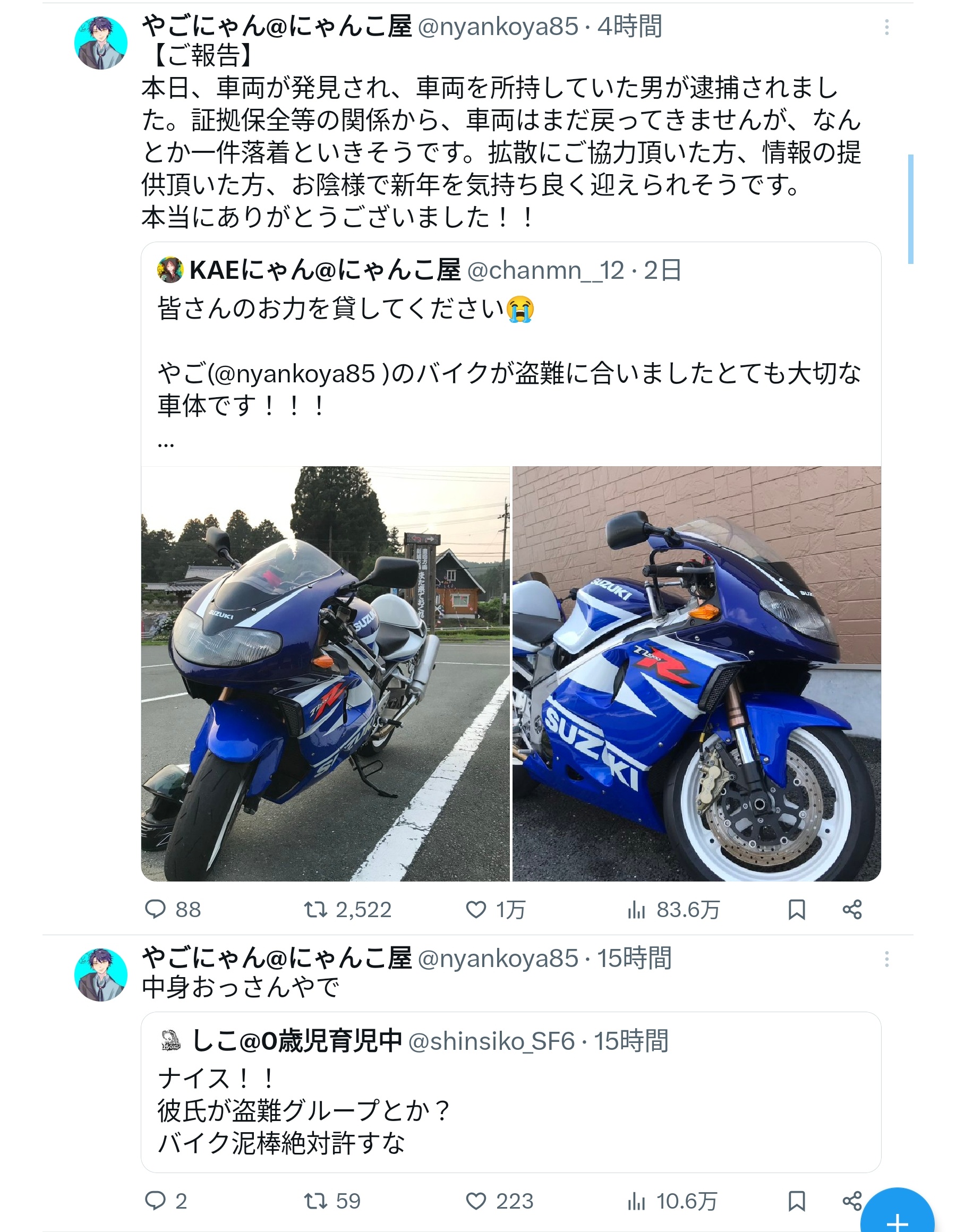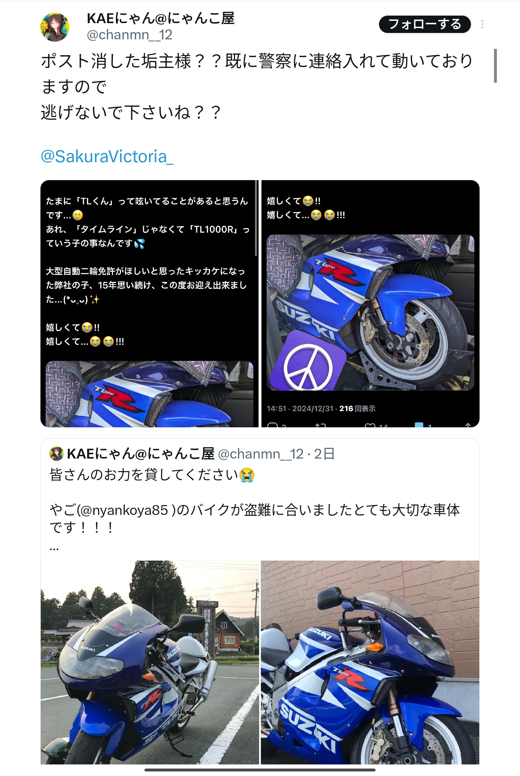 【悲報】39歳ネカマおっさん、盗んだバイクを自慢して速攻で特定され、元旦に自首