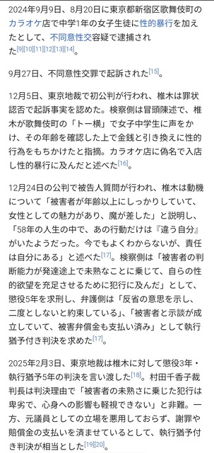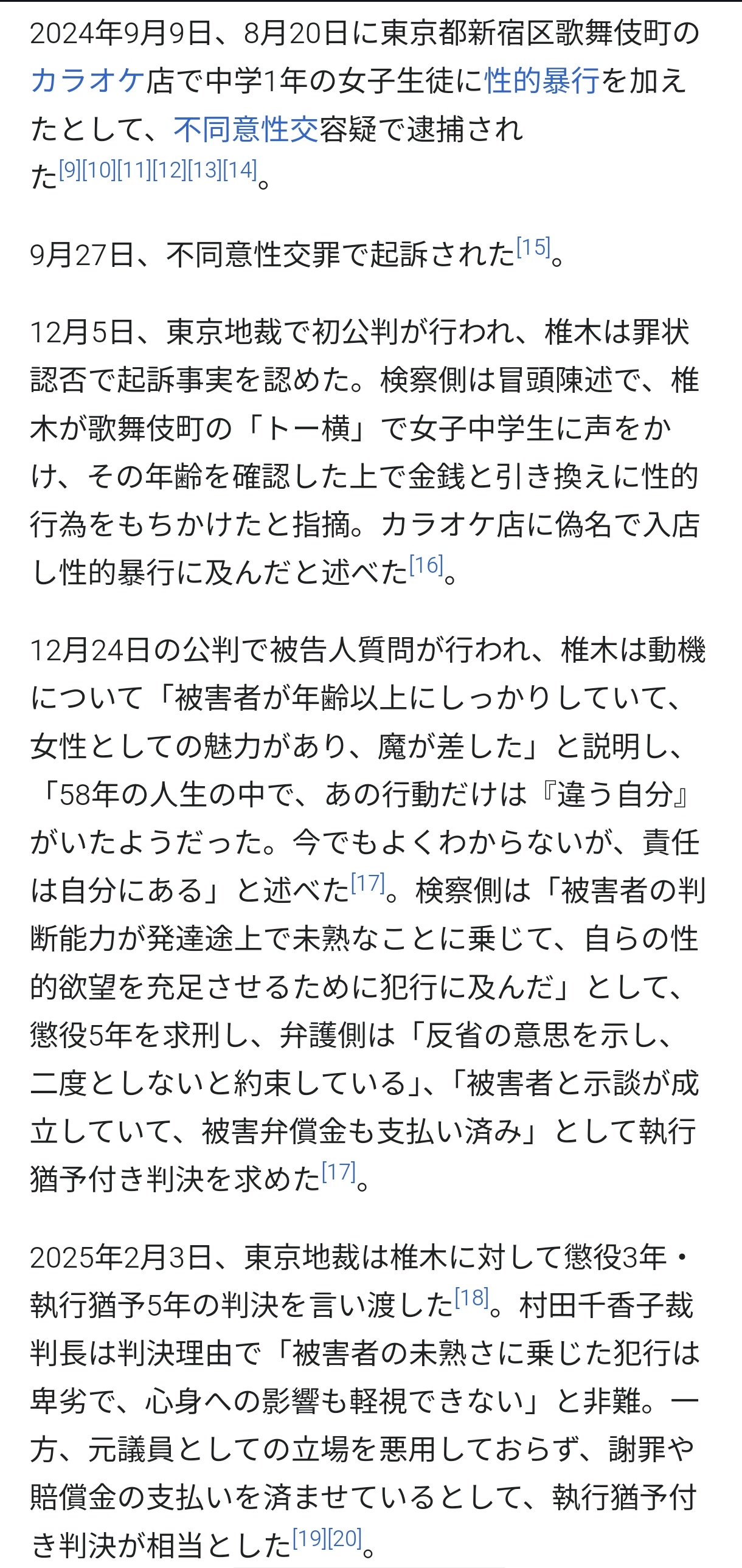 去年8月、東京・新宿区歌舞伎町のカラオケ店で、当時12歳の中学1年生の女子生徒に性的暴行を加えた罪に問われている元衆議院議員の椎木保被告(58)に対し、東京地裁は3日、懲役3年、執行猶予5年を言い渡しました。