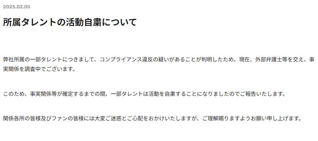 吉本興業「誰とは言えないけどコンプライアンス違反があったためそいつが活動自粛します」