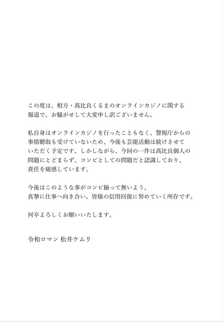 【速報】令和ロマンくるまさん、活動自粛を発表