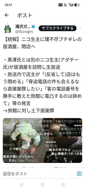 ・黒澤氏とは別のニコ生主(アダチー氏)が居酒屋を訪問し生放送