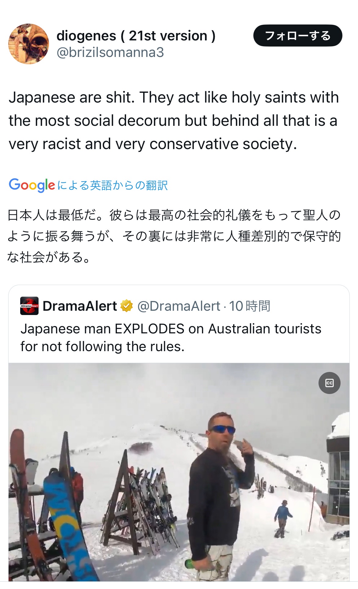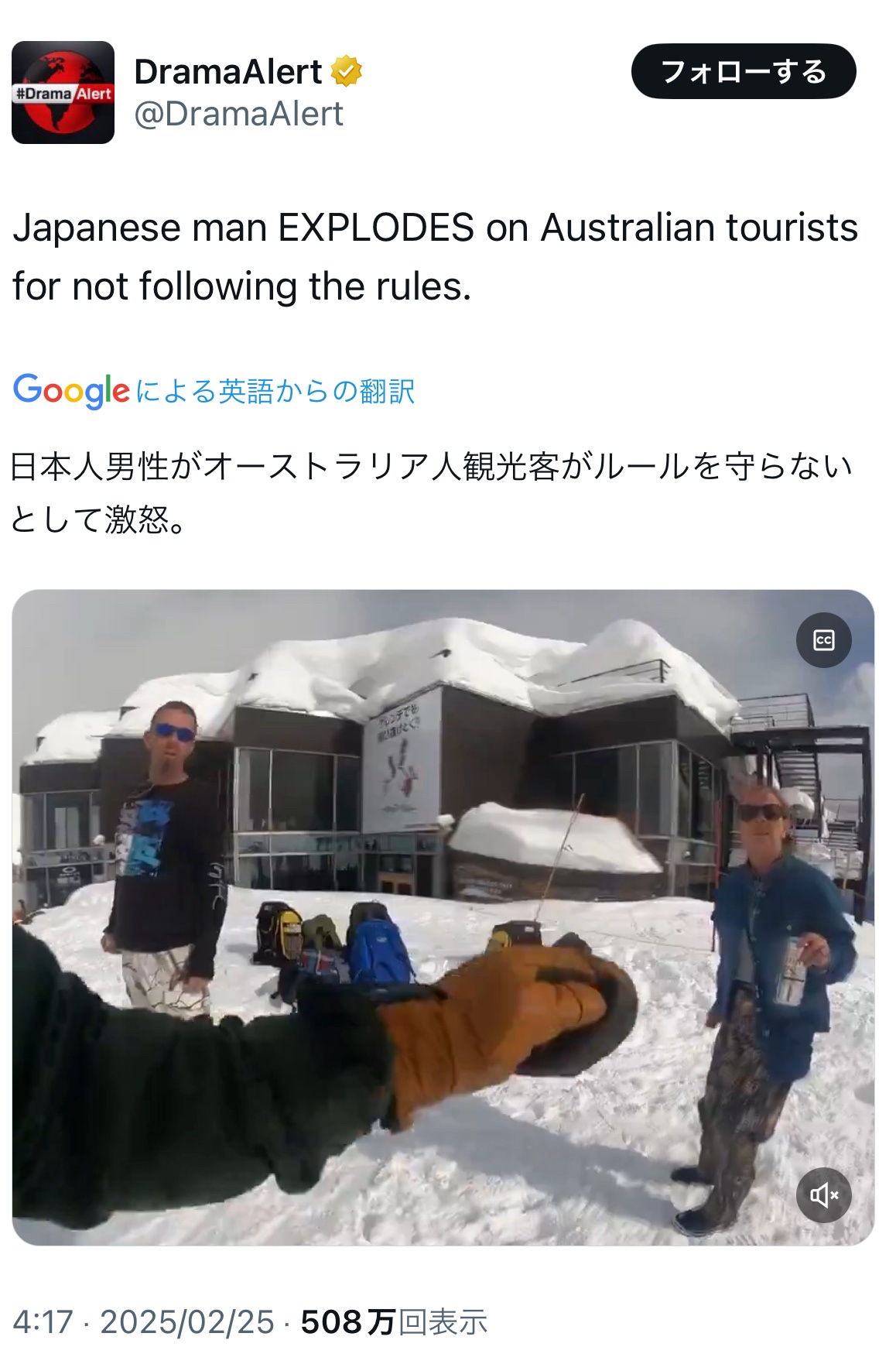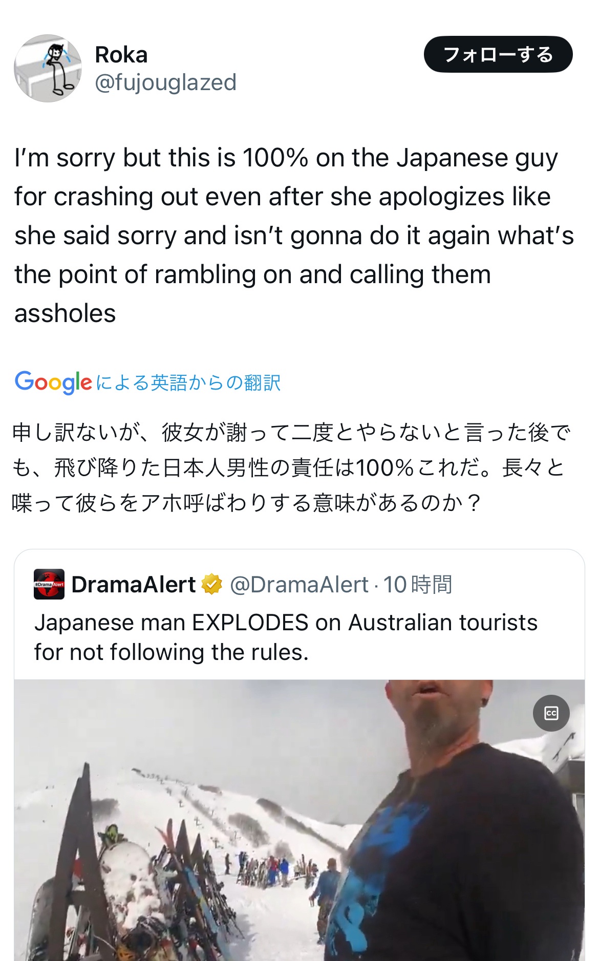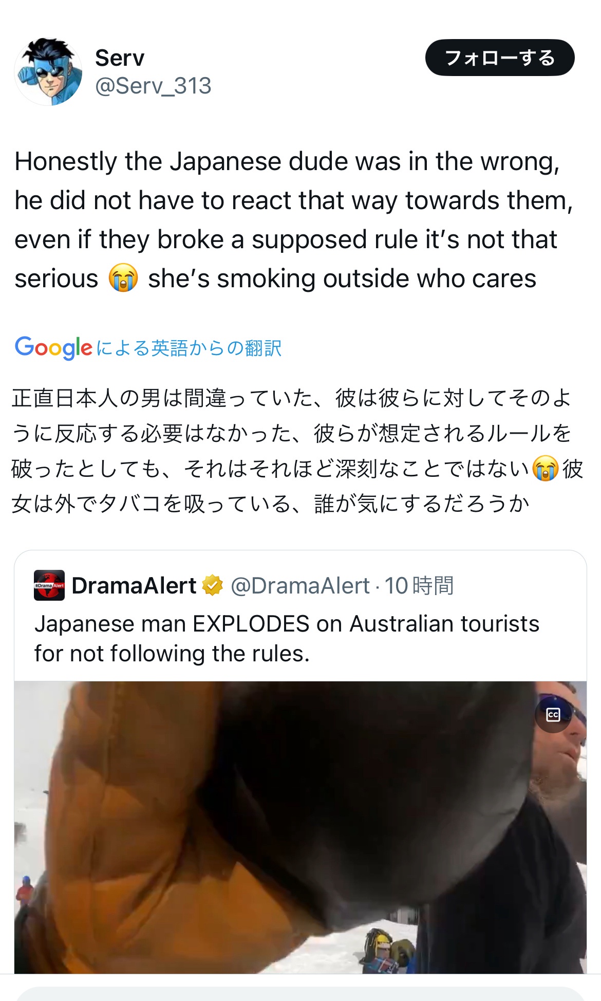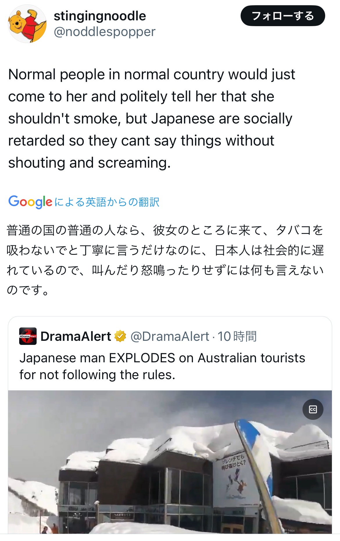 【動画】スキー場でタバコ吸っていただけの外国人観光客、日本人にガチギレされるwww