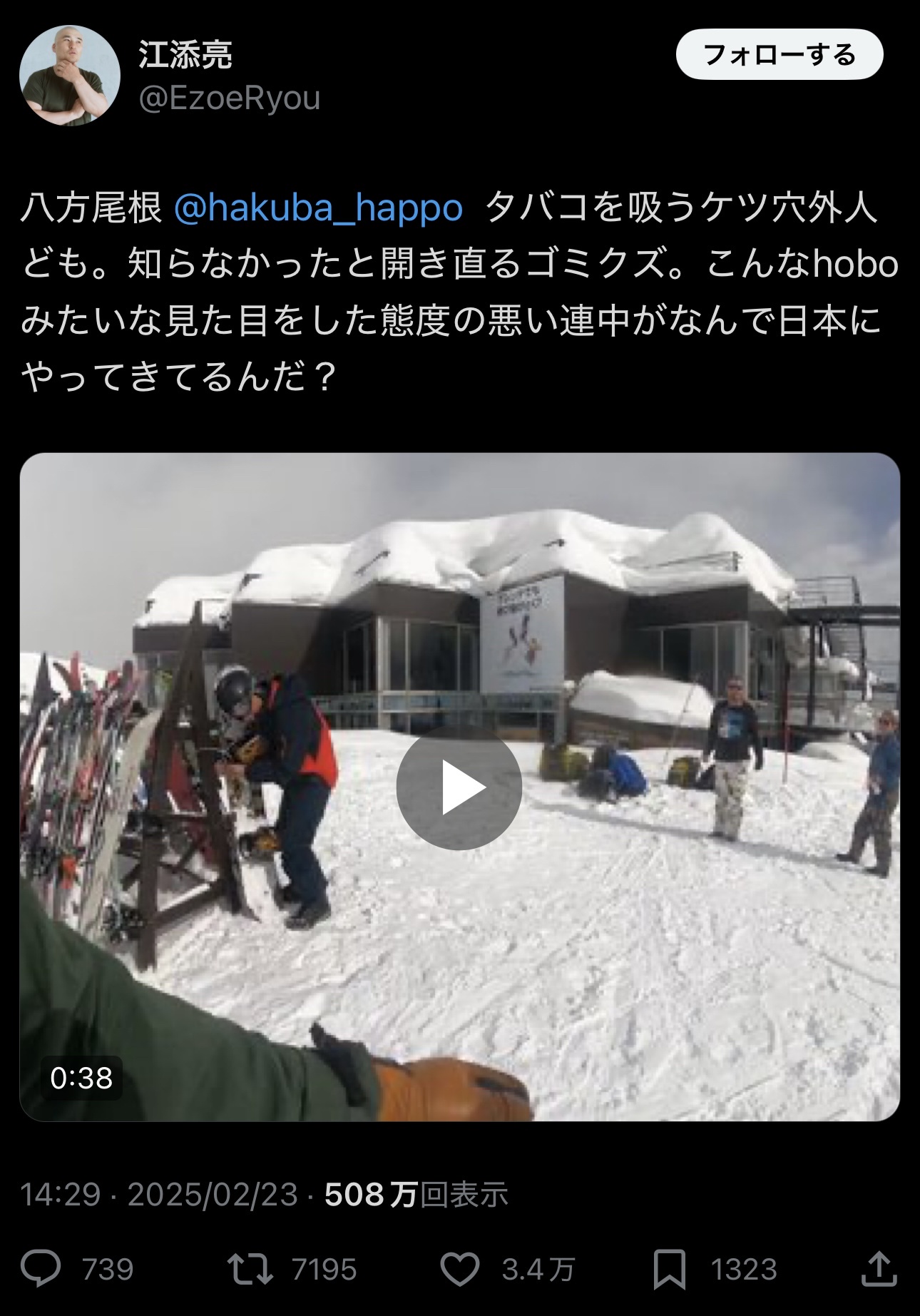 八方尾根 @hakuba_happo タバコを吸うケツ穴外人ども。知らなかったと開き直るゴミクズ。こんなhoboみたいな見た目をした態度の悪い連中がなんで日本にやってきてるんだ? pic.twitter.com/QVwPrerVNp