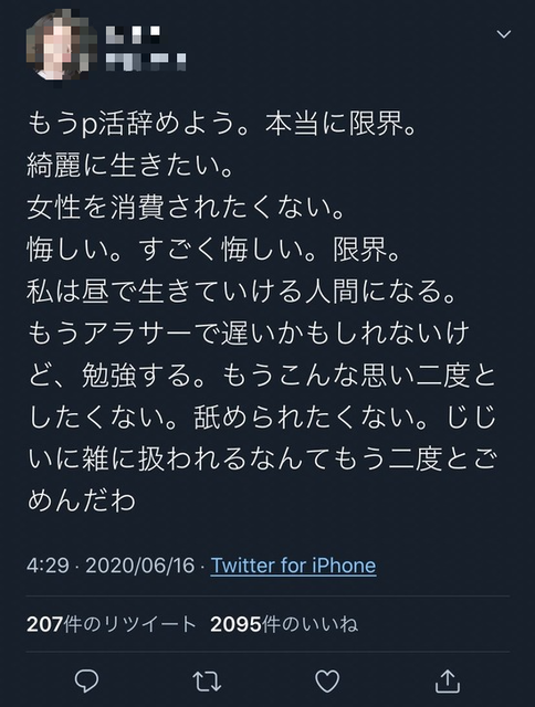 女さん「もう女性を消費されたくない、パパ活やめよう。悔しい、すごく悔しい」
