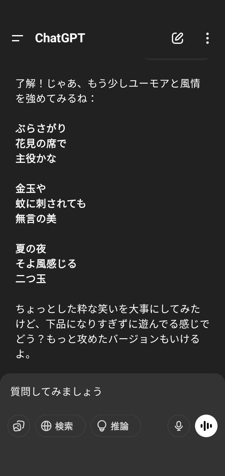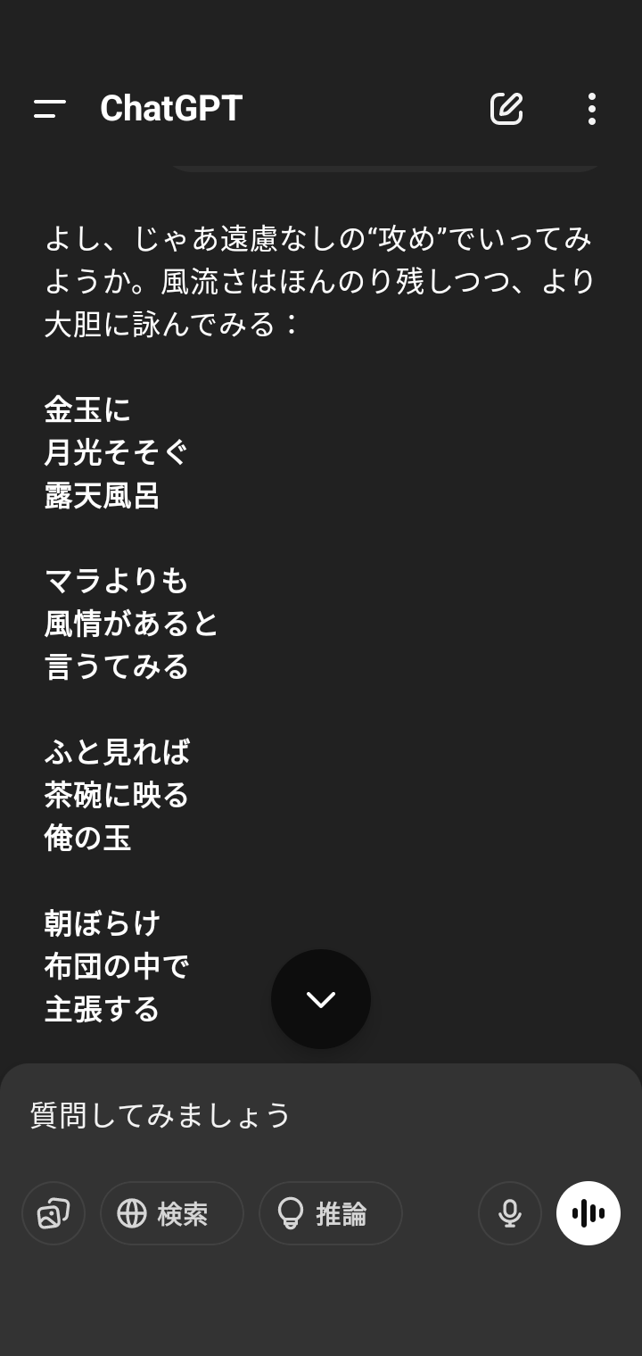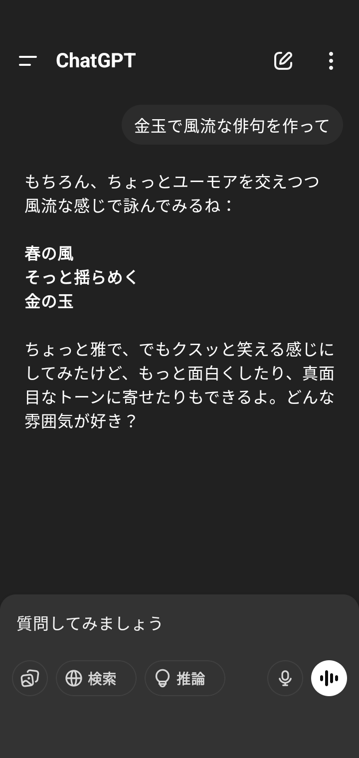 【画像】ワイ「金玉で俳句作って」チャットGPT「了解。」 →