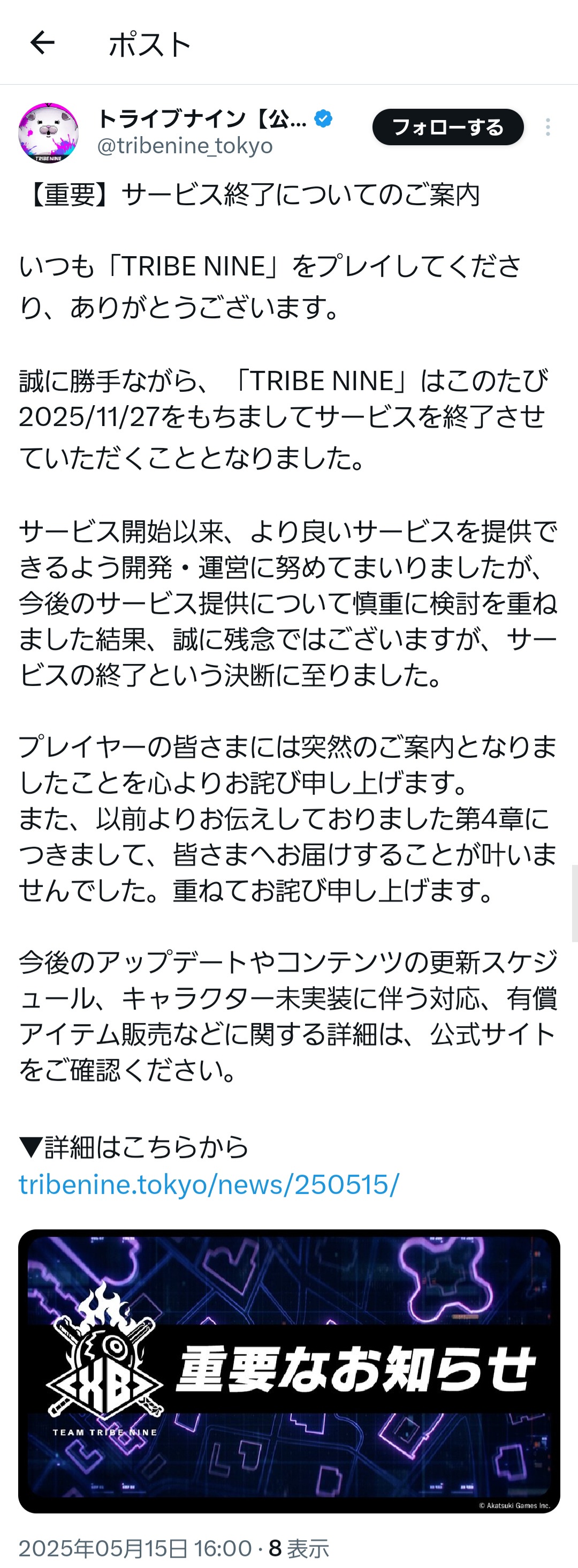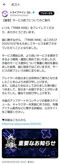 誠に勝手ながら、「TRIBE NINE」はこのたび2025/11/27をもちましてサービスを終了させていただくこととなりました。… pic.twitter.com/aLqcc5fRyx