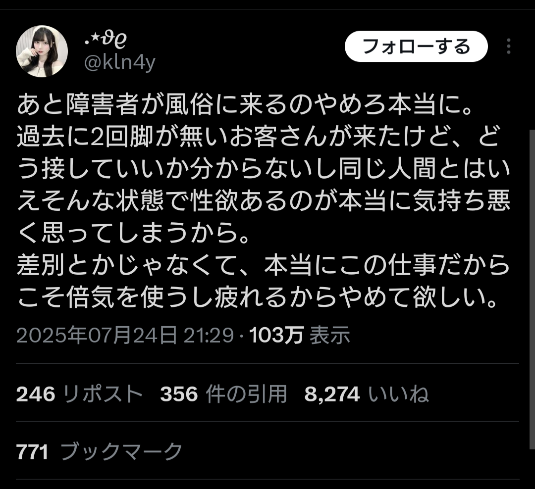 【画像】風俗嬢さん「障害者は風俗に来ないでほしい、どう接したらいいかわからない。差別じゃないけど」 2025年7月26日 最終更新日時 : 2025年7月26日 ココナラwordpress 広告エリア 【絶望画像】港区女子さん、イケメンと結婚するも子供が不細工wwwwwwwww→ 2025年12月14日(日)付け 今週発売予定のPS5・PS4ゲームソフトをピックアップ! 高市政権 新規メガソーラーへの支援廃止 【画像】日本「オリンピックの開会式?まぁこんなんでええやろ‥‥」←結果 【絶望】ロシアさん「次は日本。中国と連携して東京爆撃するわ」⇒ 【動画】今日のブレイキングダウン、ついに放送事故を超えて犯罪一歩手前まで来る 【悲報画像】黒人女性「だから黒人は日本に行きたくねーんだよ!!」→ ホロライブVファン「配信あんまないけど、たまに顔見られるだけで幸せ!」→ 推しにブロックされる😭 【画像】「12歳」と間違われた合法ロリ女(30)wwwww 『ドラゴンクエストVII Reimagined』キャラクタートレーラーが公開中!「ガボ」「アイラ」「メルビン」のトレーラーをピックアップ 【画像】風俗嬢さん「障害者は風俗に来ないでほしい、どう接したらいいかわからない。差別じゃないけど」 1:名無し :2025/07/25(金) 20:39:06.696ID:LmXJGLvh6 2:名無し :2025/07/25(金) 20:39:13.963ID:LmXJGLvh6 うんうん 3:名無し :2025/07/25(金) 20:39:23.424ID:LmXJGLvh6 障害者は性欲あるんか? 続きを読む 続きを見る(外部サイト) 広告エリア 【絶望画像】港区女子さん、イケメンと結婚するも子供が不細工wwwwwwwww→ 2025年12月14日(日)付け 今週発売予定のPS5・PS4ゲームソフトをピックアップ! 高市政権 新規メガソーラーへの支援廃止 【画像】日本「オリンピックの開会式?まぁこんなんでええやろ‥‥」←結果 【絶望】ロシアさん「次は日本。中国と連携して東京爆撃するわ」⇒ 【動画】今日のブレイキングダウン、ついに放送事故を超えて犯罪一歩手前まで来る 【悲報画像】黒人女性「だから黒人は日本に行きたくねーんだよ!!」→ ホロライブVファン「配信あんまないけど、たまに顔見られるだけで幸せ!」→ 推しにブロックされる😭 関連記事 関連記事はありません。