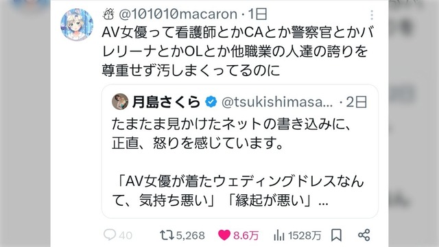 【悲報】X民「AV女優を差別するなっていうけど、AVは他の職業を尊重してないよね」→8.6万いいね