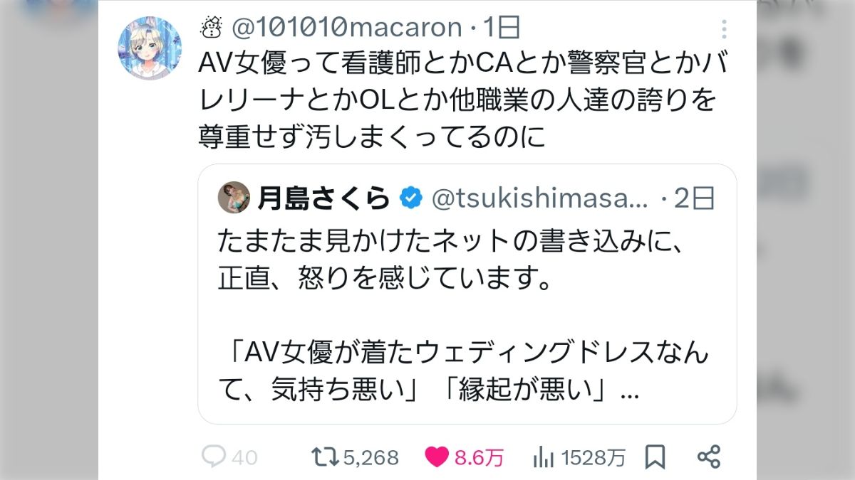 【悲報】X民「AV女優を差別するなっていうけど、AVは他の職業を尊重してないよね」→8.6万いいね