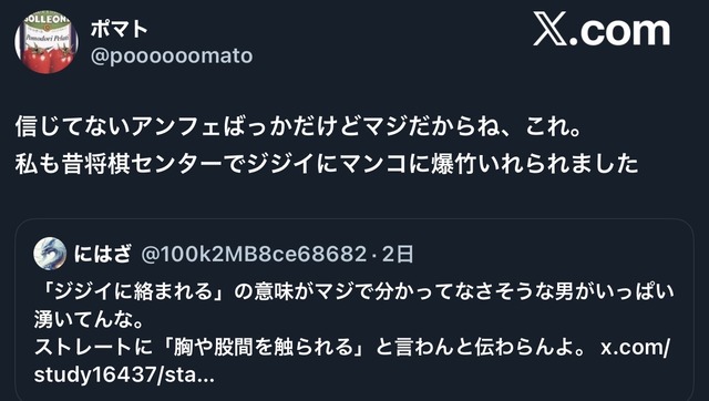 【悲報】X女さんが受けた将棋ジジイからの嫌がらせ、ガチでエグすぎるwww