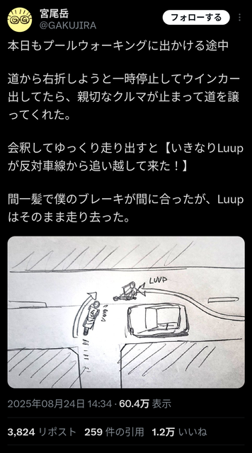 【悲報】X民「優先道路で車が止まってくれた!ラッキー」LUUP民「前の車止まったから追い越したろw ブーーーン💨」→